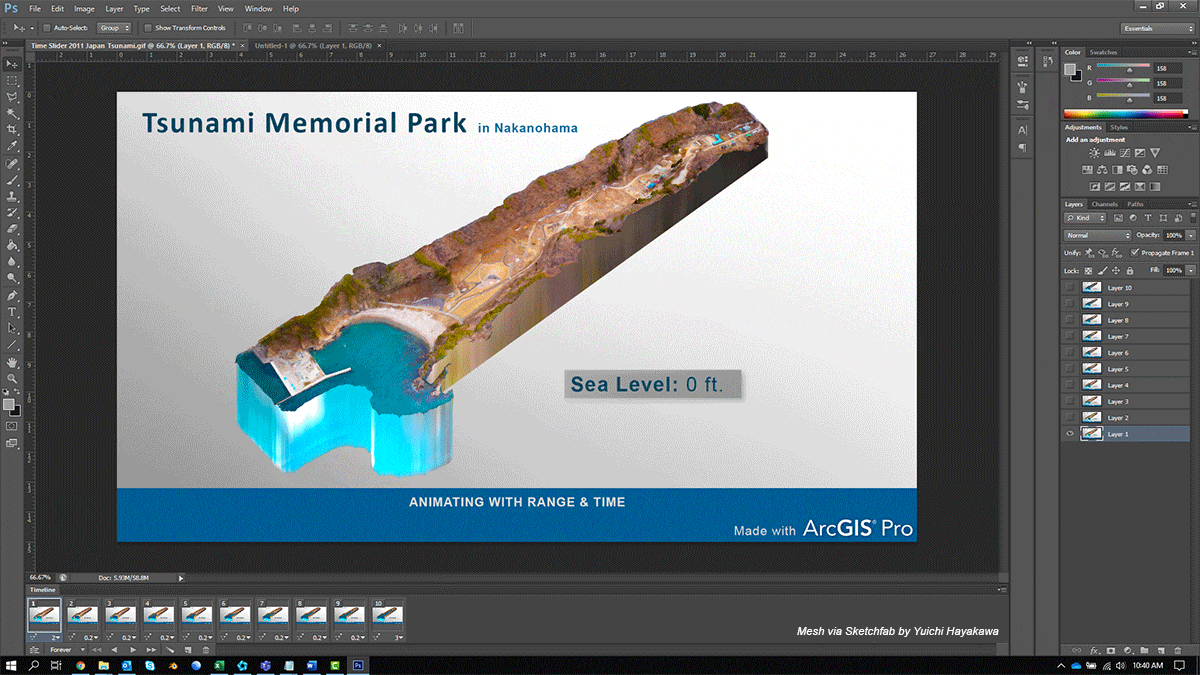 By exporting 3D with animation in ArcGIS, you can control the camera and environment variables for the viewer. ArcGIS Pro and CityEngine enable you to generate both Mp4 and GIFs. Mp4 is one of the more common movie formats used across the web. And as one of the more optimized or smaller formats, it’s typically used for uploads to YouTube and Vimeo. And GIFs are probably the most sharable image formats out there. While ArcGIS enables you to export GIFs, they can often become very large files if you attempt to output it directly from ArcGIS Pro. Therefore, it’s a good idea to export single frame Jpegs or PNGs and aggregate them into a GIF in Adobe Photoshop.