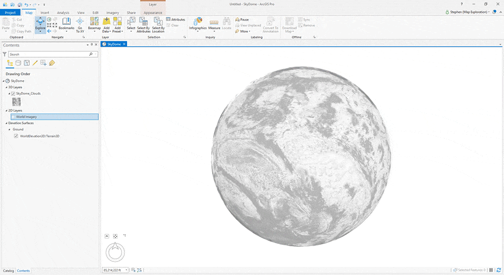 This is a simple trick you can use to spice up your 3D projects. While the skies in ArcGIS Pro look beautiful with their gradient blues, you can easily fill them with clouds by adding a Sky Dome. A Sky Dome is a spherical mesh that surrounds the globe itself. There are several ways you can bring it in, although I personally found consuming it as a 3D symbol had the best results. As a 3D symbol, you can see the clouds from below and above the atmosphere.