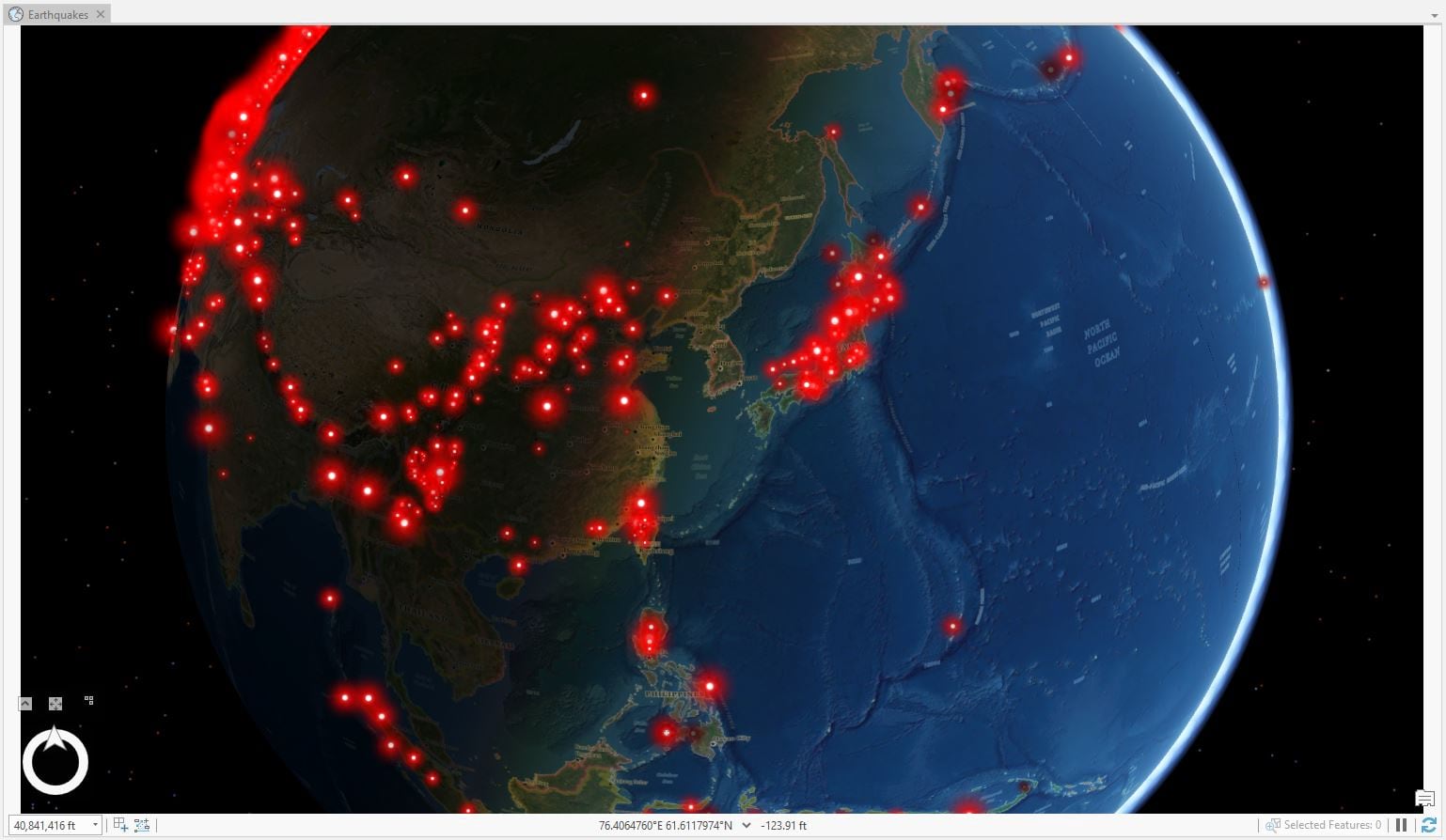 In the image below, the Ring of Fire is clearly highlighted by the symbology used. And while the red glowing balls show intensity through scale, the earthquake Richter scale is indicated by infusing an intensity map (or gradient).