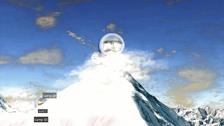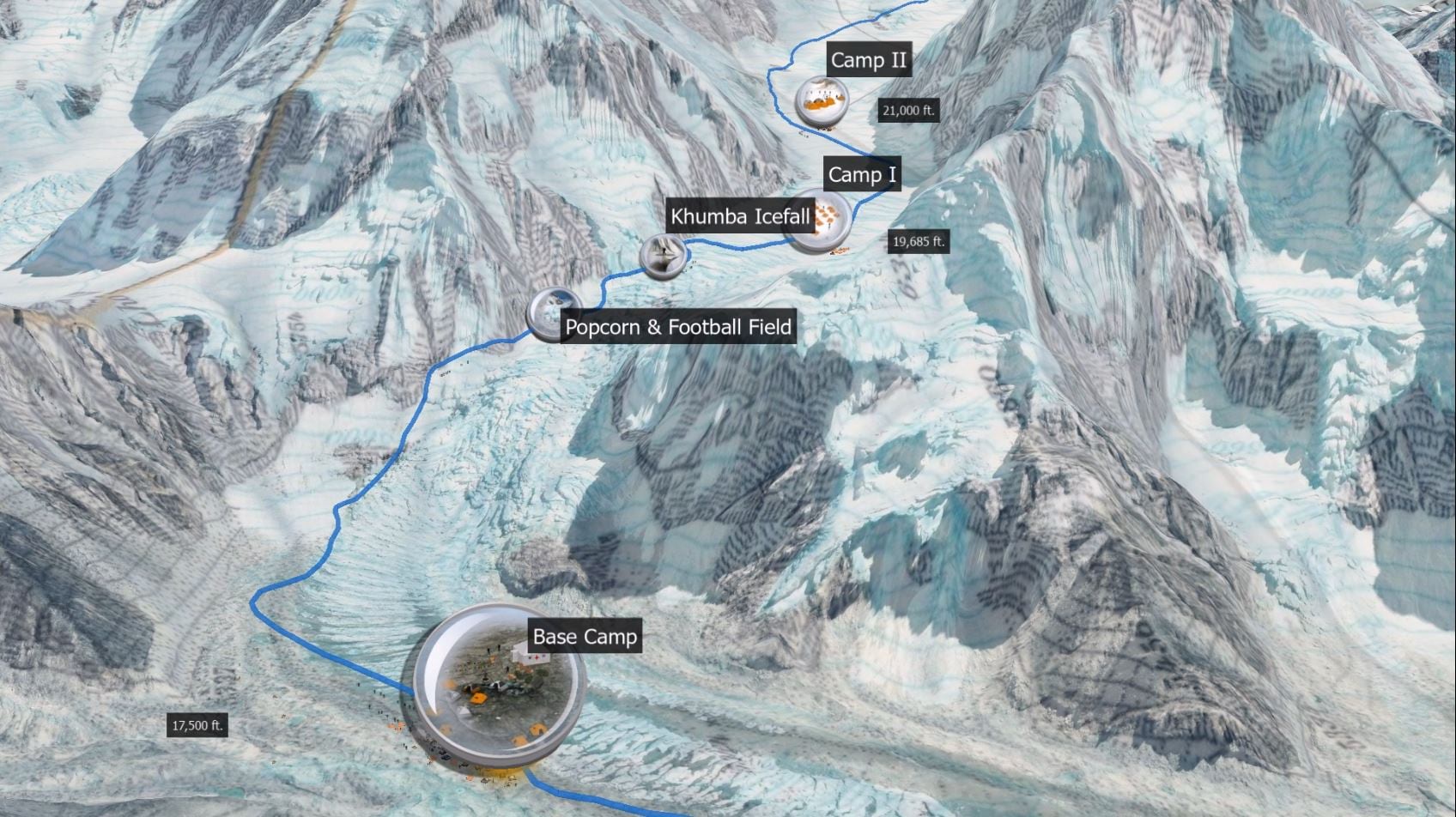 While symbology is often used as a generic place holder, it can also be a specific 3D model or 2D illustration. Oftentimes highlighting landmarks on a map that otherwise might be out of view due to the camera height is a good way to call attention to it. Additionally, varying your symbology will add an extra level of attention to each area of the map. For example, while each base camp along Mount Everest’s South Col Route are very similar, they do have various visuals that differentiate their elevation and risk level.