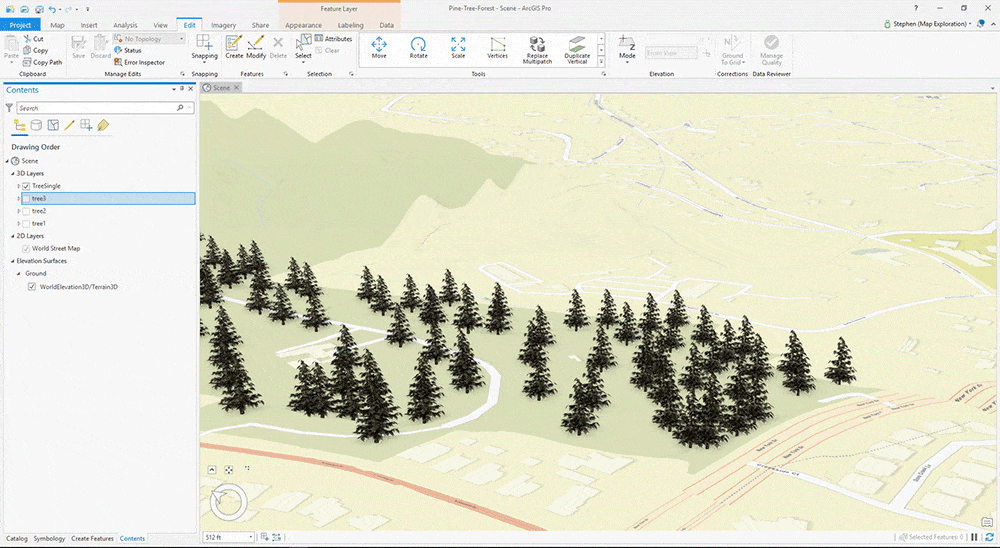 A landscape or terrain is made up of diversity. In some cases, a map’s simplicity can communicate data effectively with it’s clean and concise visuals. Although if your attempting to replicate or create a digital twin of an environment, it’s important to emulate the diversity of nature on your 3D terrain. This means not only providing diversity to the species of vegetation, but also changing the rotation and scale of the symbology populating an area. For example, rotation and scale of a pine tree that makes up a region will make it more believable.