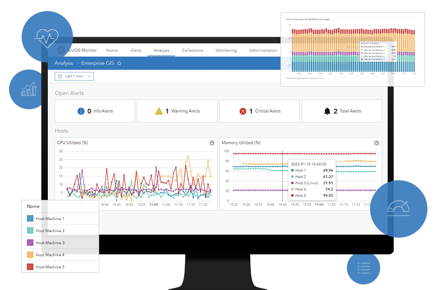 We used ArcGIS Monitor and enterprise IT monitoring tools like Windows Performance Monitor to monitor the system’s performance and capture telemetry on its behavior under certain conditions, like: