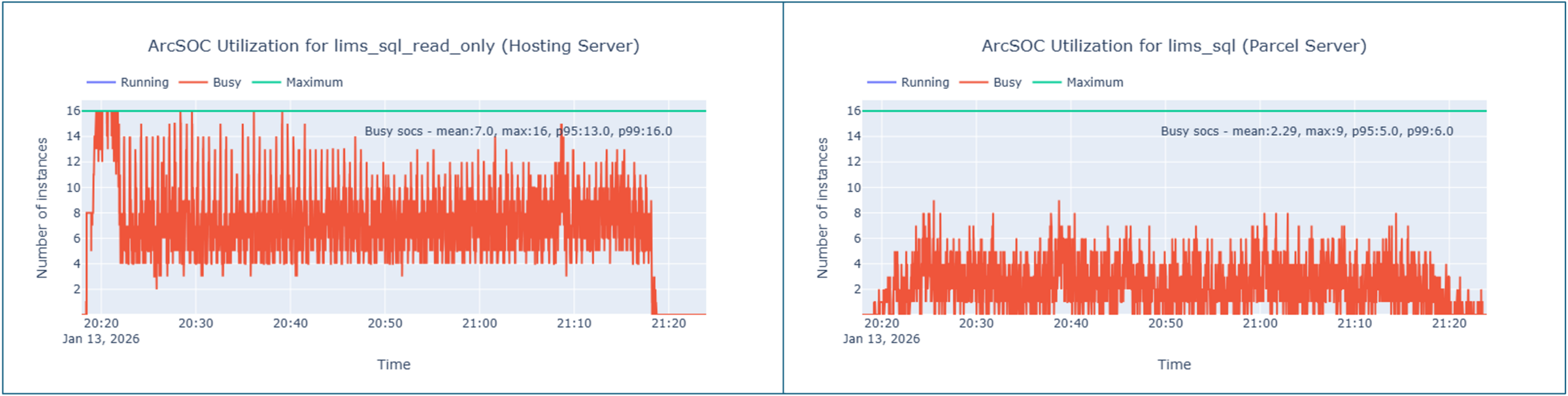 In the graphic below, you can see our service instance utilization metrics- in particular, how often ArcSOCs were busy across the test duration for both our hosting server (left) and parcel server (right).