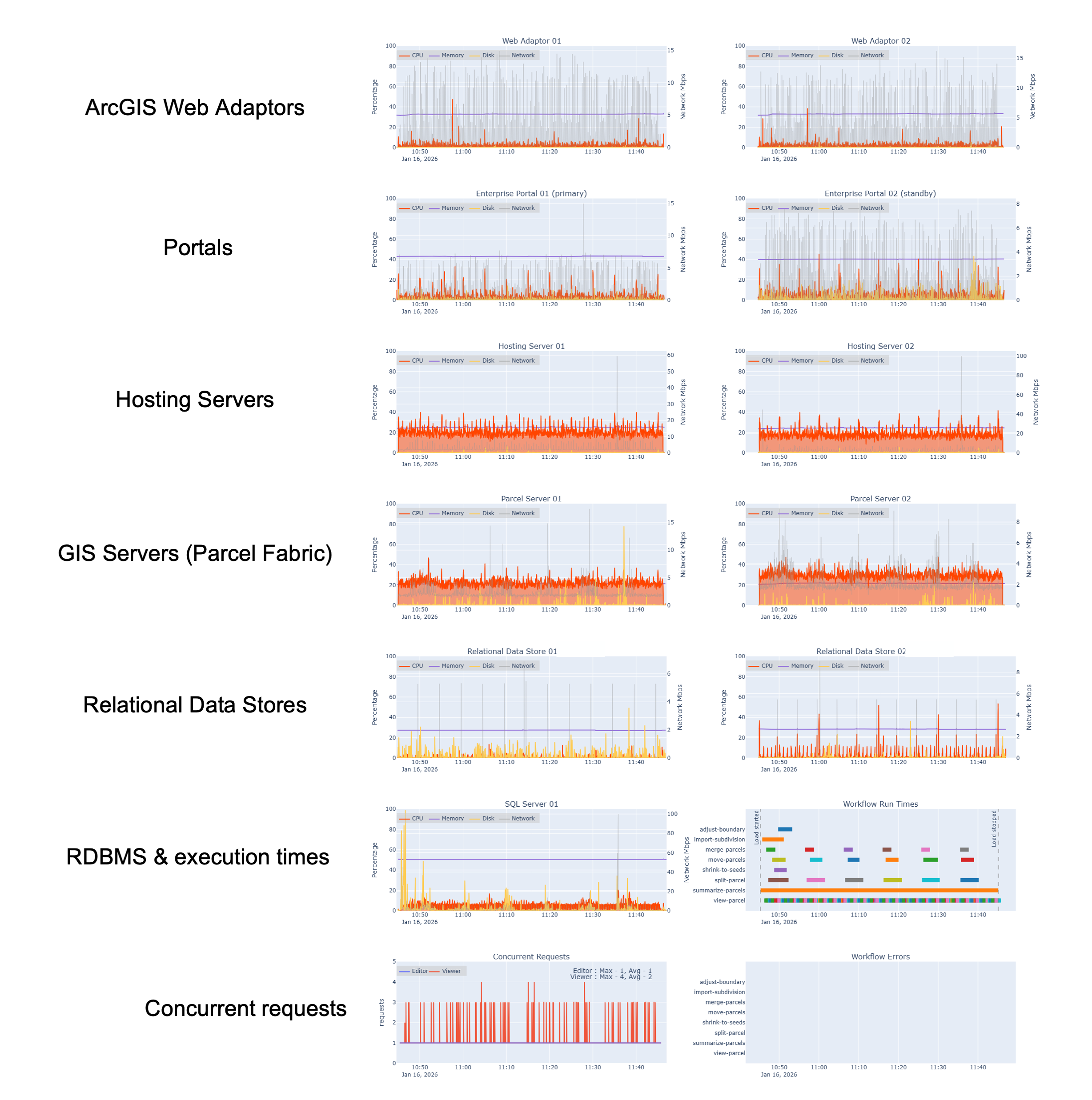 At the infrastructure layer, we monitored system resources on each virtual machine hosting ArcGIS Enterprise components and our enterprise geodatabase, like: