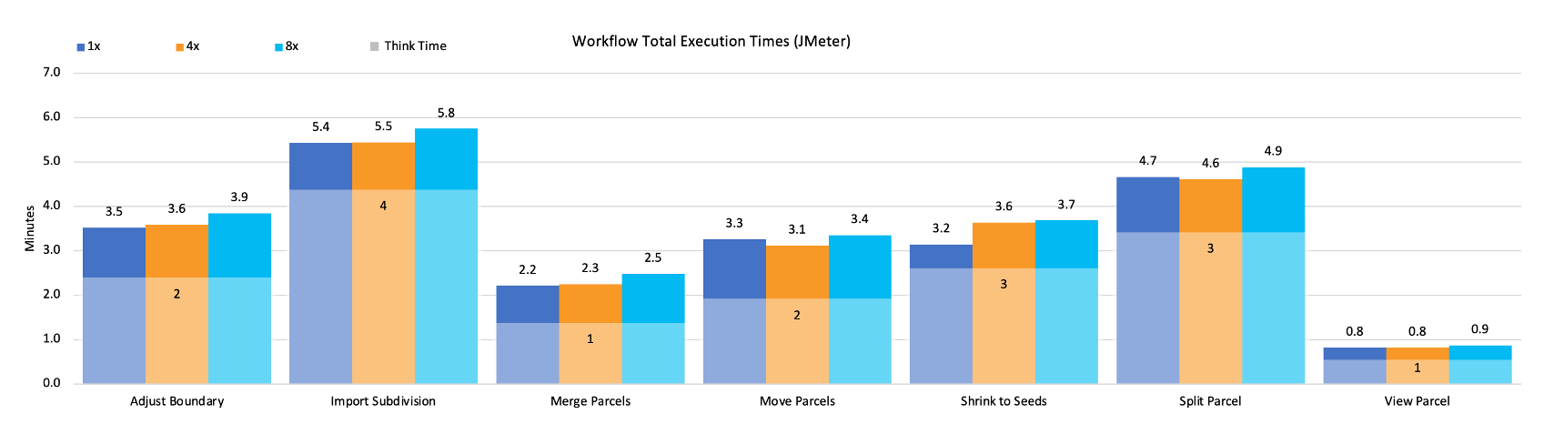In the chart below, you can see a summarization of our workflow execution time across all of our tested workflows at different load scenarios (design load, 4x, and 8x design load). If workflow times increase as the load increases, this would tell us that the increased requests are likely straining the system and creating longer service wait times than expected. In this case, there is a negligeable change in workflow times as the load increases.