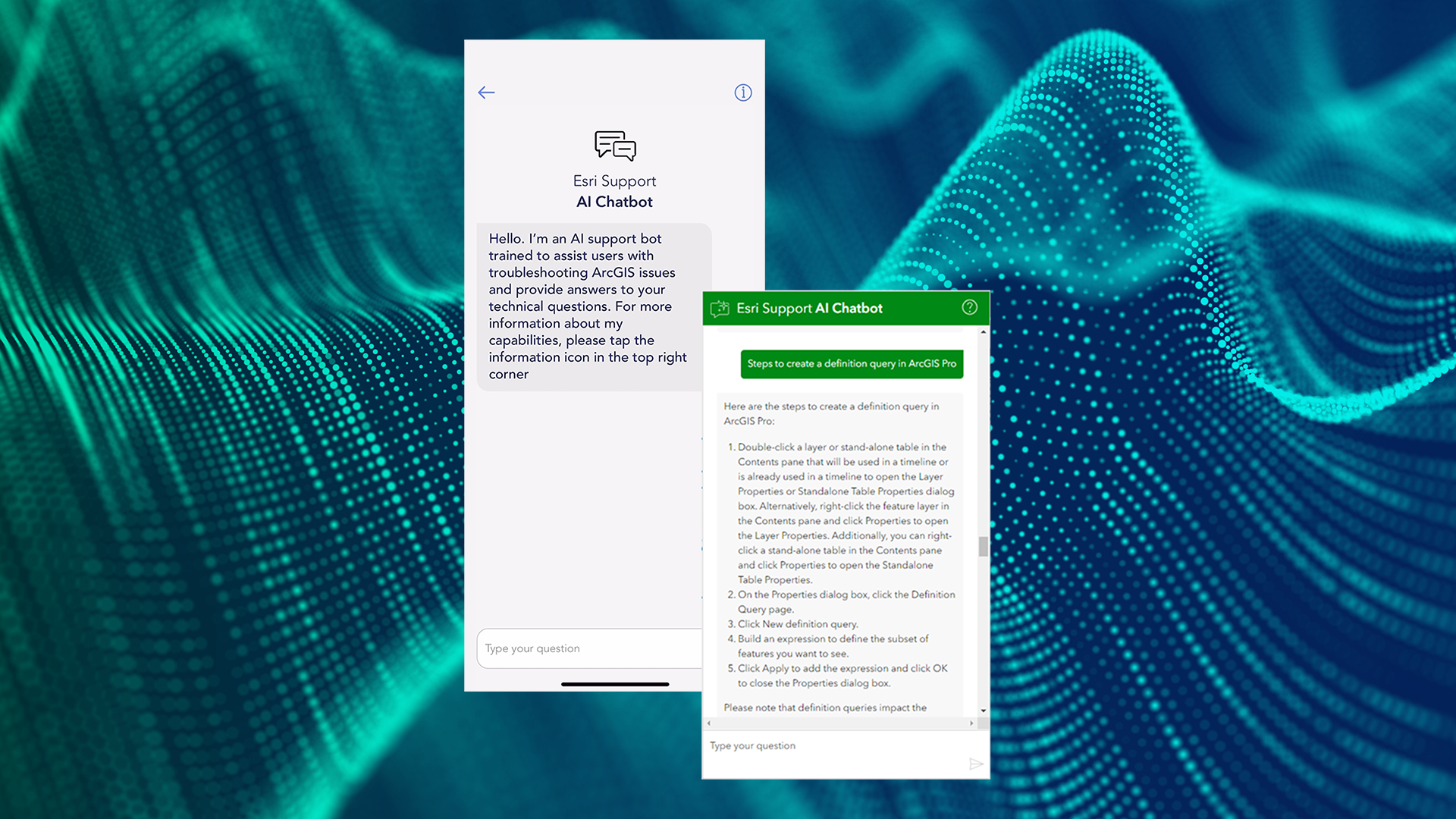 We want to make sure you always have access to the information you need. Between our analysts and the chatbot, you can rest assured that your GIS project and implementations are fully supported. When you run into a problem, give the chatbot a try on the Esri Support site or in the Esri Support app.