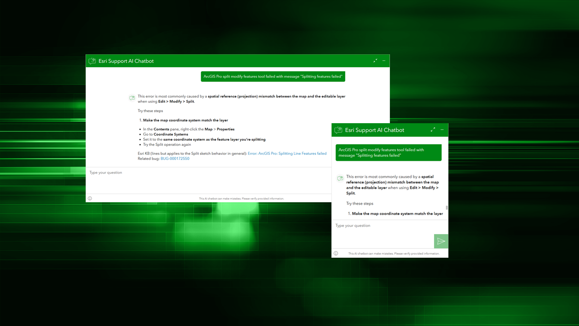 The Esri Support AI Chatbot is specialized for GIS troubleshooting. It’s trained on a library of technical content from documentation, product teams, and support. Unlike other chatbots, it also updates regularly as new content is added to those databases. In fact, some content is exclusive to the chatbot, not available elsewhere, so you’re getting a smarter answer than you would anywhere else. Also, because its answers are based on these libraries, not the internet as a whole, you can be sure the answers it returns are based on validated Esri content.