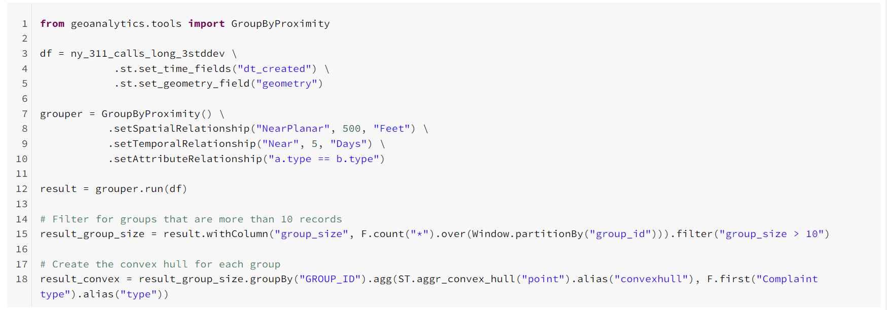 The Group by Proximity parameters are set so that the tool will find groups of the same complaint type that occur within 5 days and 500 feet of each other. Xirui further narrows her results down to groups of more than 10 records.