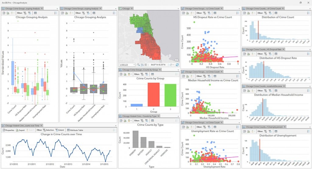 Visualization with charts, graphs, and tables is a way to extend the exploration of your data, offering a fresh way to interpret analysis results and communicate findings. Typically you might begin by browsing through the raw data, looking at records in the table. Then maybe you’d plot (geocode) the points onto the map with different symbology and begin creating different types of charts (bar, line, scatter plot, and so on) to summarize the data in different ways (by district, by type, or by date).