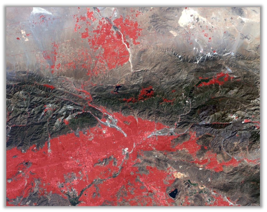 This model can also be used for change detection, as you can run it on imagery from two different times and see the change in land cover, such as that caused by a wildfire. In the image below, you can see the growth of urbanization. New residential areas are shaded in red.