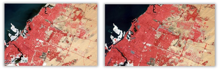 You can see how urbanization is affecting areas across the globe with this model. For example, you can see how the human footprint has increased around Sharjah in the UAE from 2015 to 2021 in the following images: