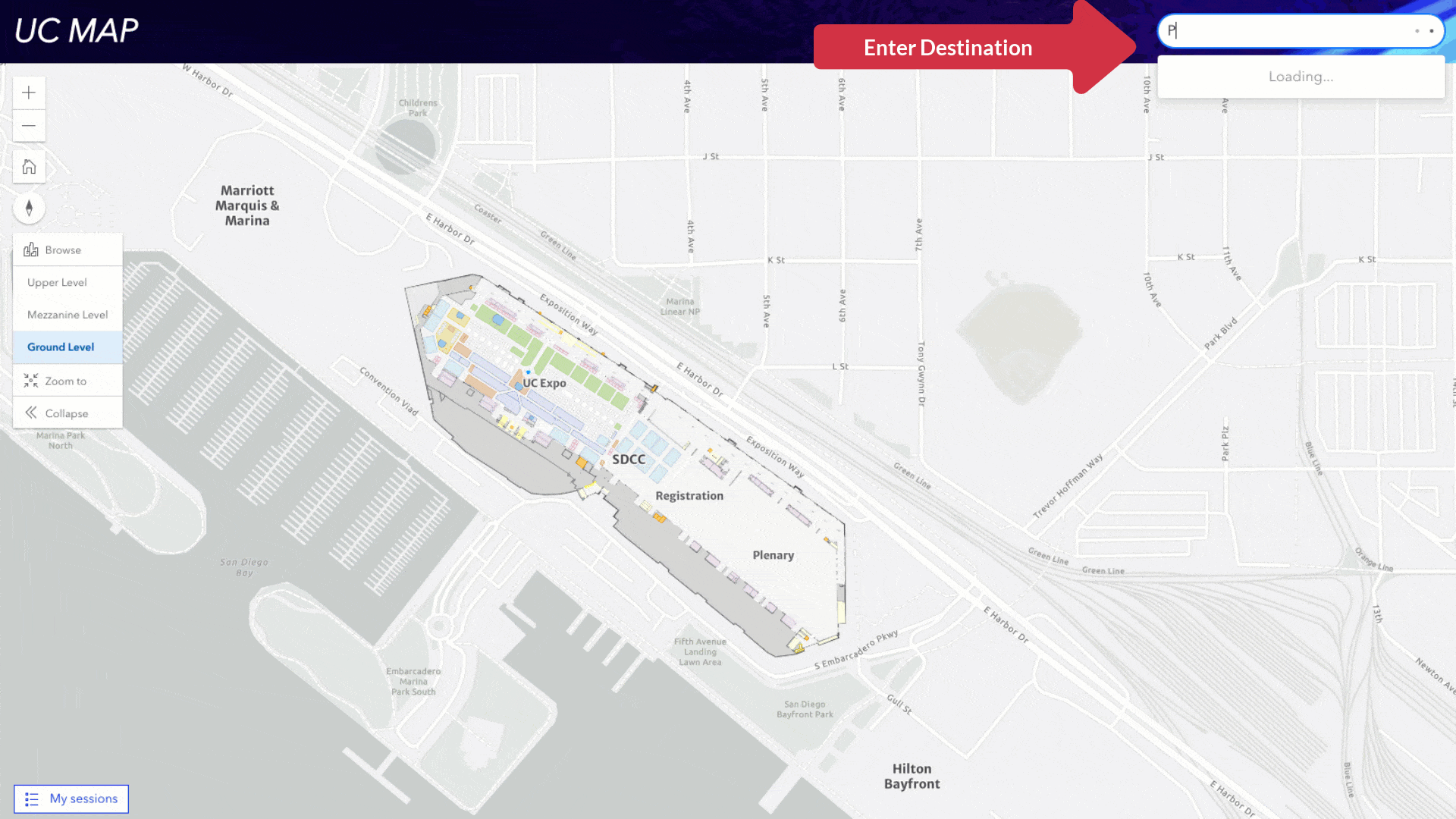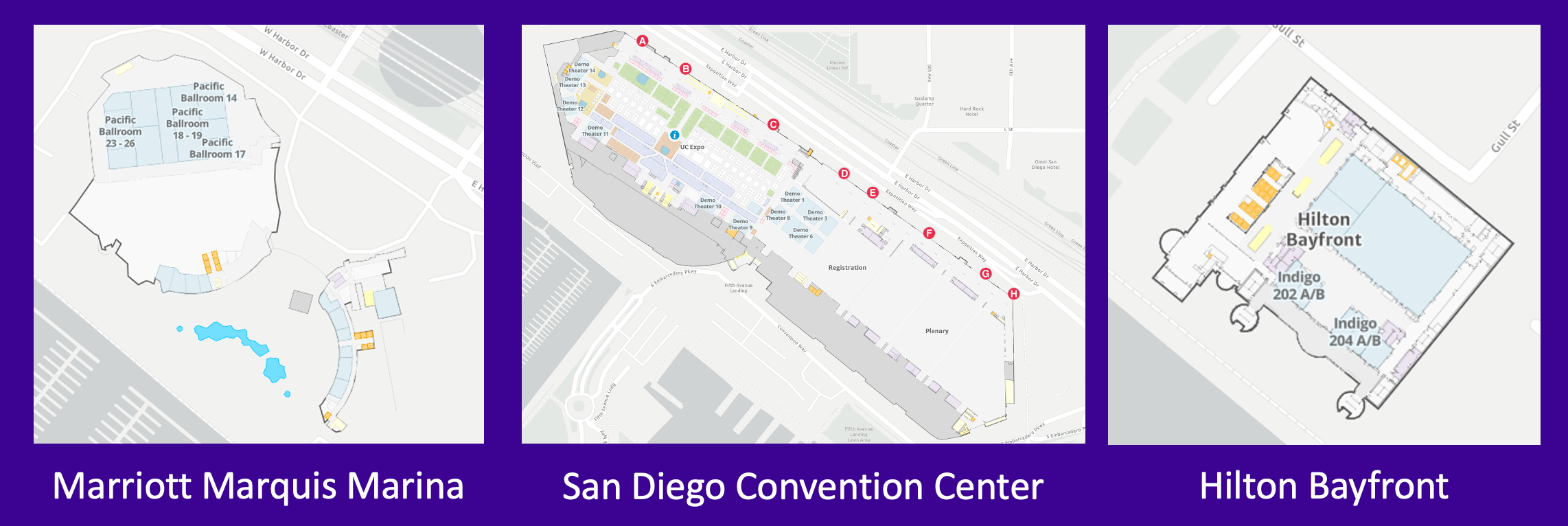 - Generate turn-by-turn directions to and from event locations in the San Diego Convention Center, Marriott Marquis, and Hilton Bayfront.