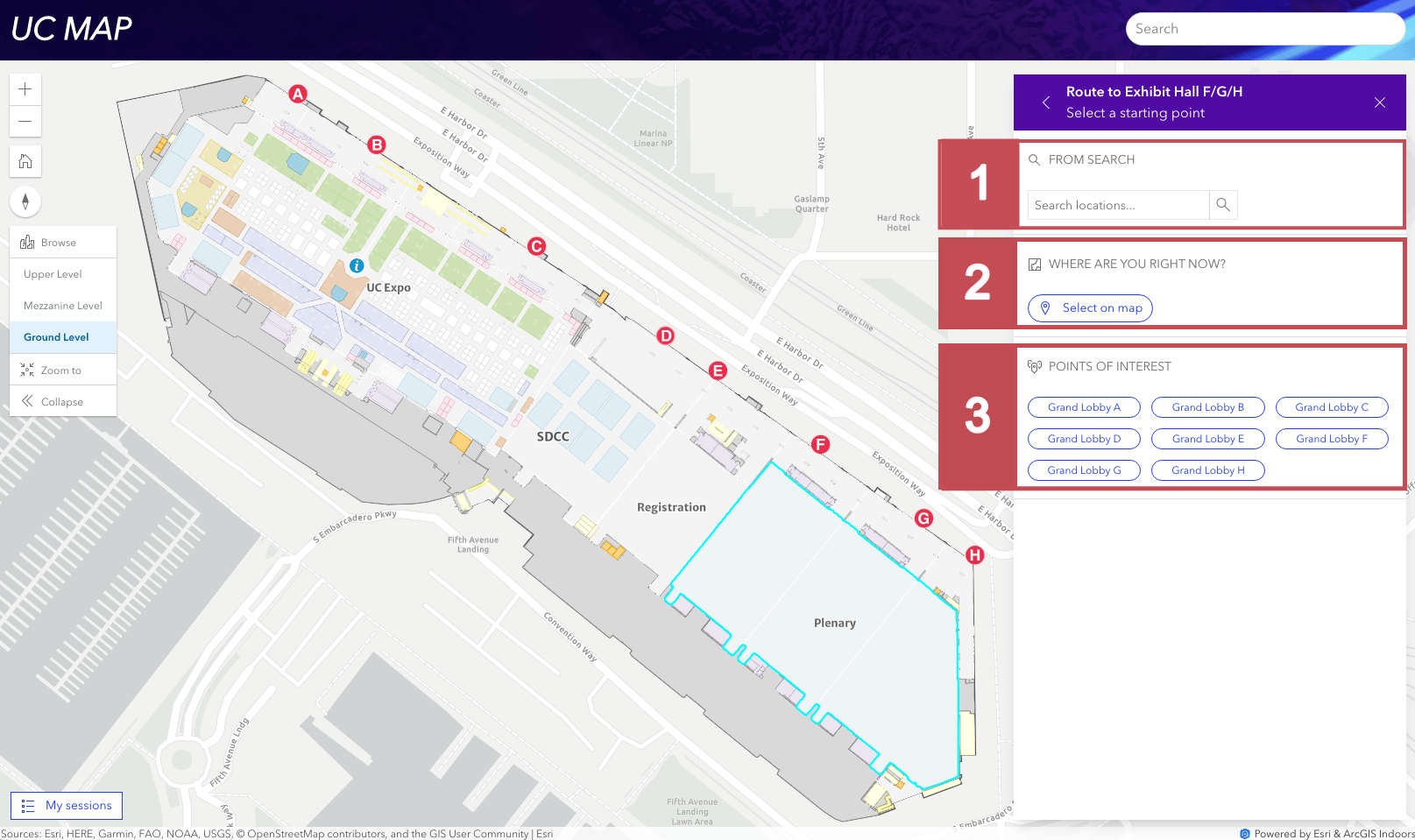 The UC Event Map uses the ArcGIS Indoors information model and was made using ArcGIS Pro, ArcGIS Online and ArcGIS Maps SDK for JavaScript.