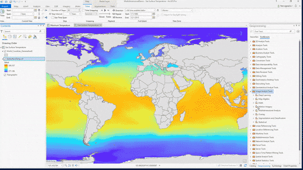 The ArcGIS Image Analyst extension has been augmented with several enhancements and features. Working with multidimensional datasets is now easier in this release with the addition of a new set of tools and capabilities to aggregate data over time and calculate anomalies across multiple variables and dimensions. The raster object has new multidimensional capabilities, supported by several new ArcPy functions. More raster analysis capabilities are available through raster functions. Based on customer demand, we introduce the Pixel Editor. Users can now interactively manipulate pixel values for raster and imagery data. Pixel Editor allows you to edit an individual pixel or groups of pixels at once. Editing operations include editing of elevation datasets and multispectral imagery, redaction and noise removal, and reclassification of categorical data.