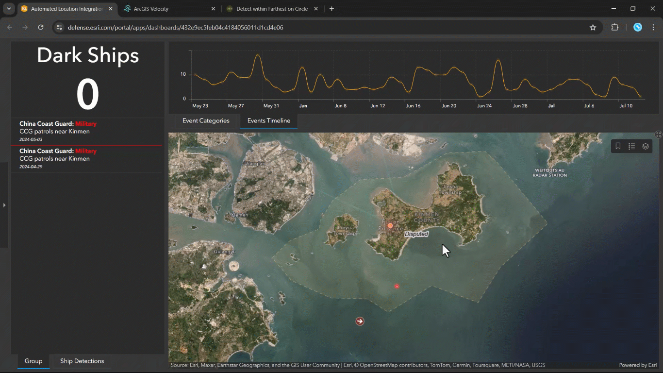 We can see the analytic in action around Kinmen County, a series of islands off the coast of China that are owned and operated by Taiwan. Here, a simulated vessel meeting our criteria moves eastward toward a disputed area. As the vessel approaches the restricted zone, its status changes, triggering an alert via the ArcGIS Velocity analytic. Upon entering the restricted area, the vessel slows down and eventually stops transmitting its location. This event activates a visual notification on our dashboard, indicating that the vessel has gone dark.