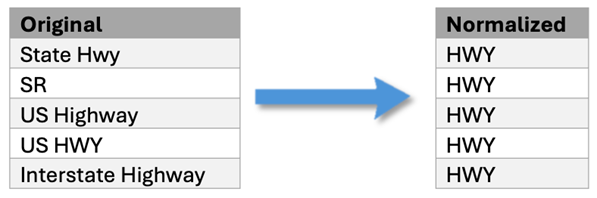 Another example of normalization would be the conversion of a series of differently named highways to a single name.