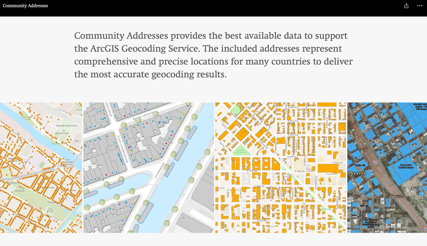 The ArcGIS Community addresses program allows local organizations to feed their curated data directly through to Esri for inclusion in our geocoding capability. That way we can validate and verify the existence of an address against the most comprehensive up to date sources. At the same time Esri is working with commercial organizations who are focused on building out addresses for interior spaces such as apartments and units. This helps us achieve the broadest possible coverage and the most comprehensive data to geocode or validate addresses against.