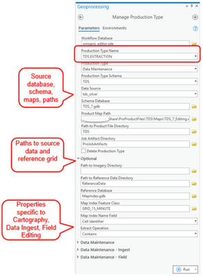 This new framework requires different extended property tables in the Workflow Database than previously used in ArcMap. There is no automated migration of the previous tables to the new format, meaning that your existing Extraction, Cartography, and Field Editing operations (for example) must be re-created in ArcGIS Pro. These are called Production Types in the new workflow framework, and it is a straightforward process using a geoprocessing tool to create them and set key paths and properties. See the following image:
