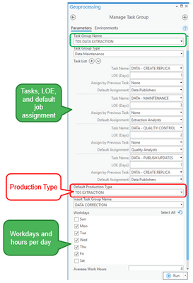 In the example, we are defining that for TDS Extraction, tasks (child jobs) will be created to create the replica, maintain (edit), QC, and finally to publish the data updates. Sample task groups such as this are included in ArcGIS Production Mapping to use as a starting point. You can add, remove, reorder, and modify the tasks using the tool above as you need. For example, if a specific type of work does not require a formal QC process, the DATA-QUALITY CONTROL task can be removed. Or, if all QC should flow through a specific group, the Default Assignment for the QC task can be set to that group. Additionally, expected levels of effort (LOE) can be defined along with standard working days and hours. This enables the workflow system to automatically generate an overall expected level of effort for each Task Group (parent job) by aggregating those of each child task, and tracking how delays in any child task will affect start dates of tasks downstream and ultimately the expected due date of the parent job.