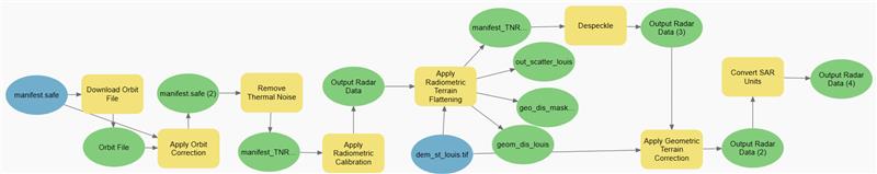 To get to our analysis, we will first need to create a Sentinel-1 SAR analysis ready dataset using tools from our Synthetic Aperture Radar toolset. First, we start with a Level-1 Sentinel-1, interferometric wide (IW) swath mode GRD dataset, and a 10 mt resolution DEM.