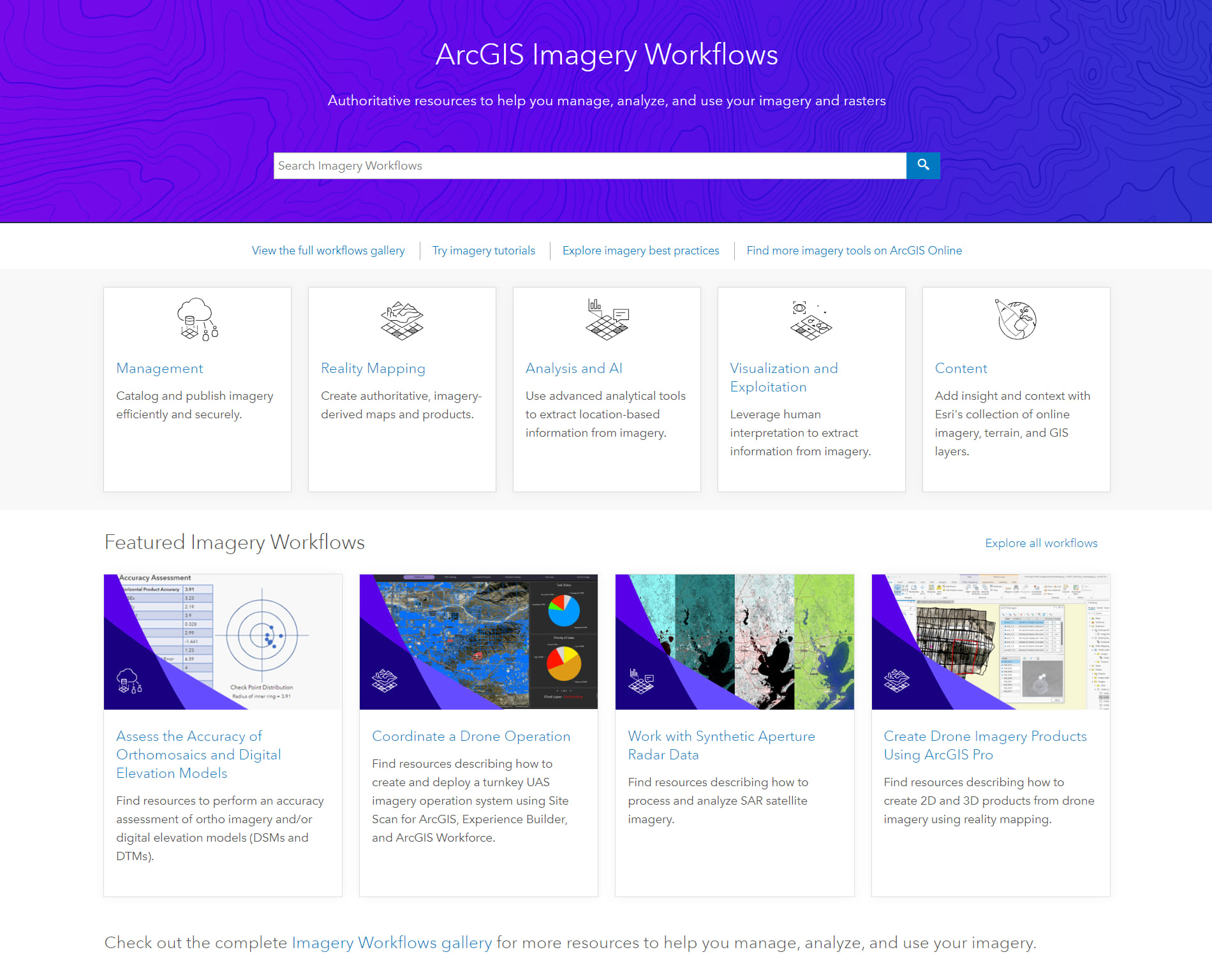The Imagery Workflows website provides a jumping off point that helps you take the proper steps to perform imagery workflows by explaining an ArcGIS solution to a common imagery problem and aggregating helpful resources from across Esri to help you solve it.