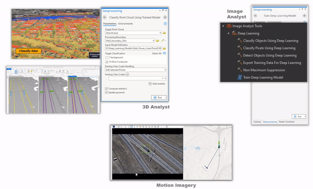 We updated tools to capture training samples, export training data, and train models, to use with imagery, 3D (includes enhancements to 3D Basemaps solution), point clouds, features, text, and video (object tracking). Furthermore, the labelling tool is simplified to support object classification and motion imagery workflows.