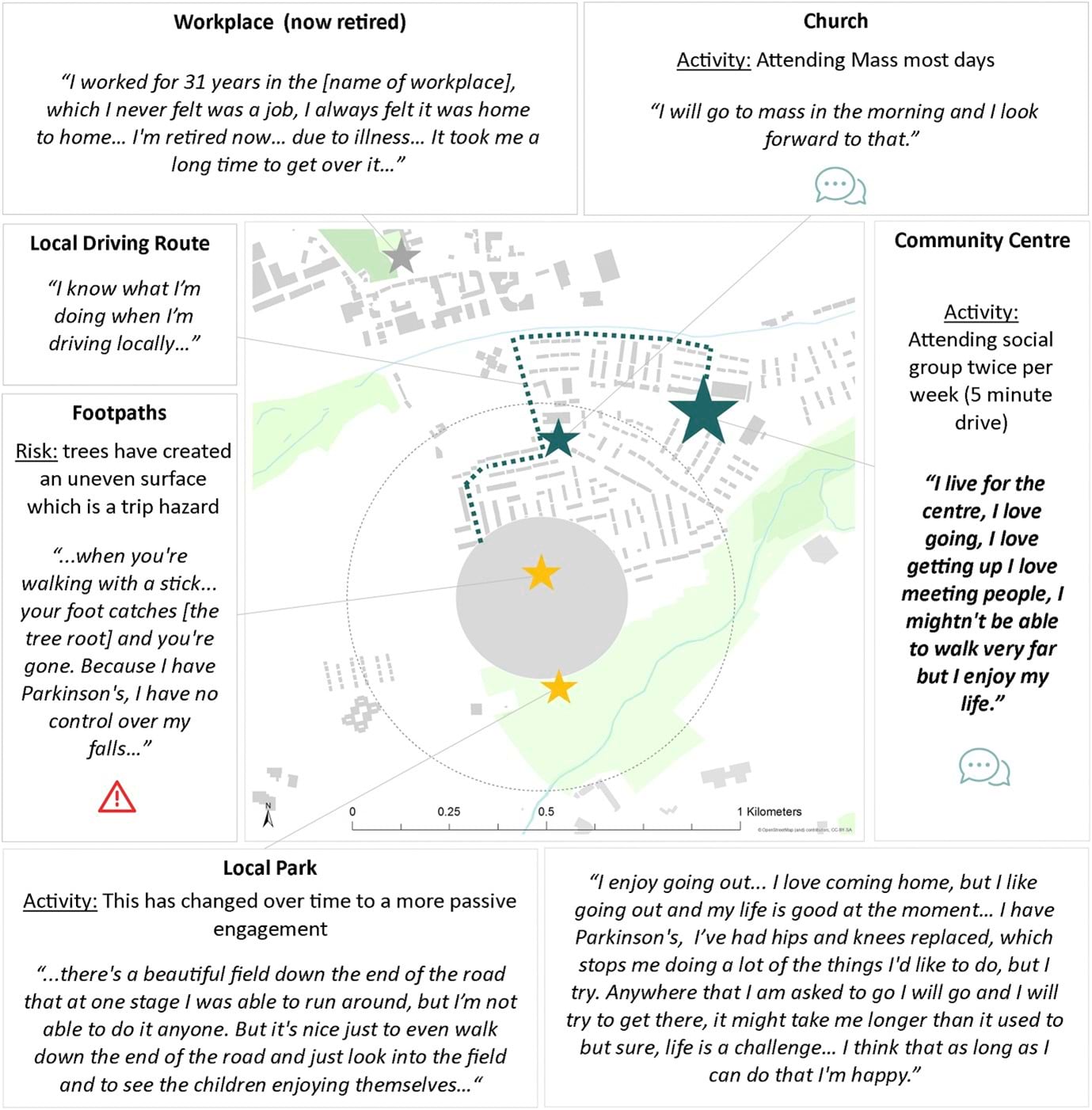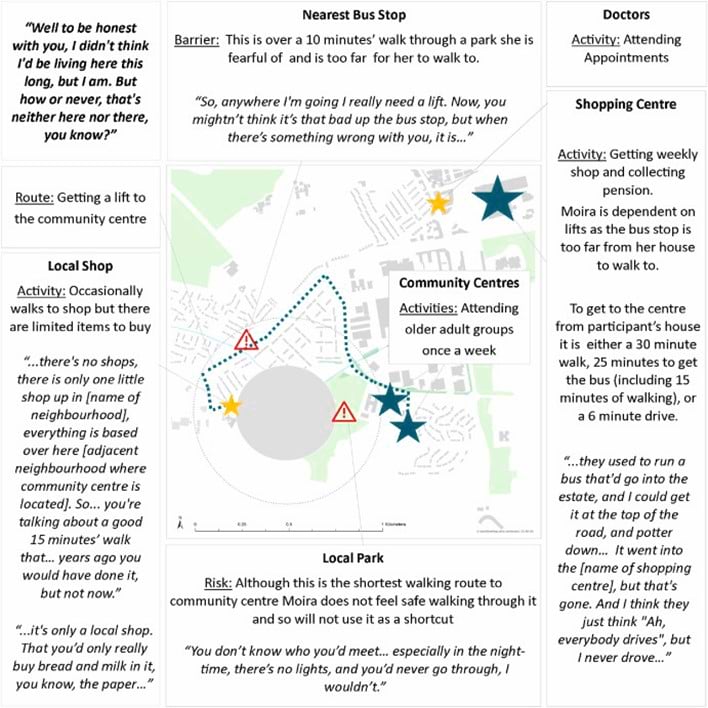 For her fieldwork, Dr. Grove collected both qualitative and spatial data. She conducted interviews with participants which included a mapping activity, where participants identified the places, routes, routines and interactions of most importance to them. Participants then took part in an optional go-along interview or interview on the mobile, where they showed some of their daily routines.