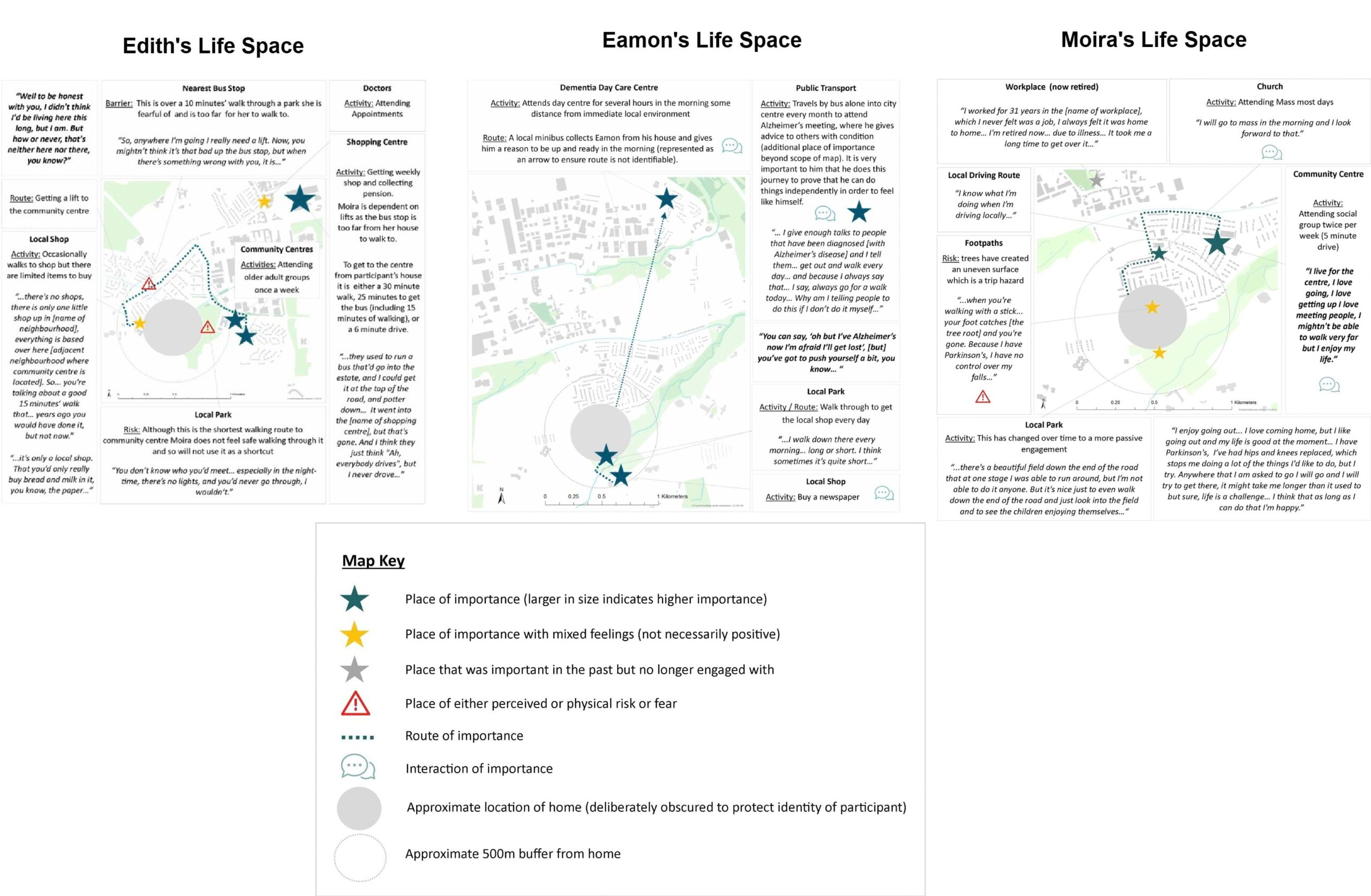 Here is a map series of three participants’ life spaces. The three participants here were Edith, Eamon, and Moira. Each life space in the series has the same symbology.