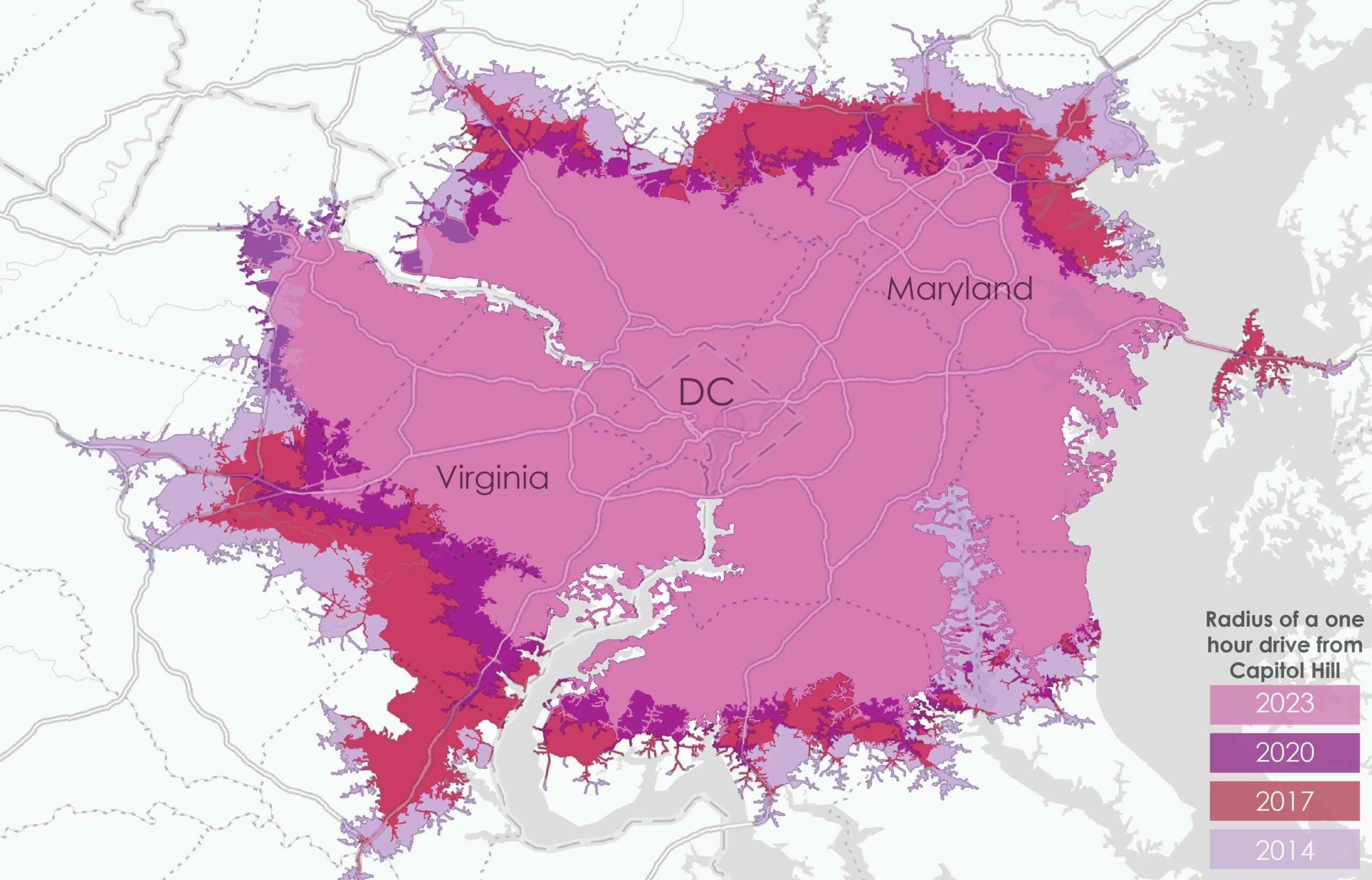 Another set of tools that allow you to add the street network into the equation is the Network Analyst extension for ArcGIS Pro. While typically used by businesses to optimize route planning, researchers and analysts also use Network Analyst in their work. For example, our very own Maggie Carmody showed that a one-hour drive from Capitol Hill has been shrinking over the years due to increased traffic in Washington, DC.