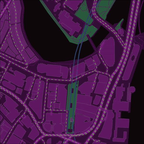 For this map, the goal was to animate the transit and simulate traffic. I ended up making a very simple dashed line for the roads. For the rail, I made some circular shapes with a little distortion trailing them. That was it. Two very simple animations. But I think they do a good job adding movement to the map. I am not joking when I said, I went simple.