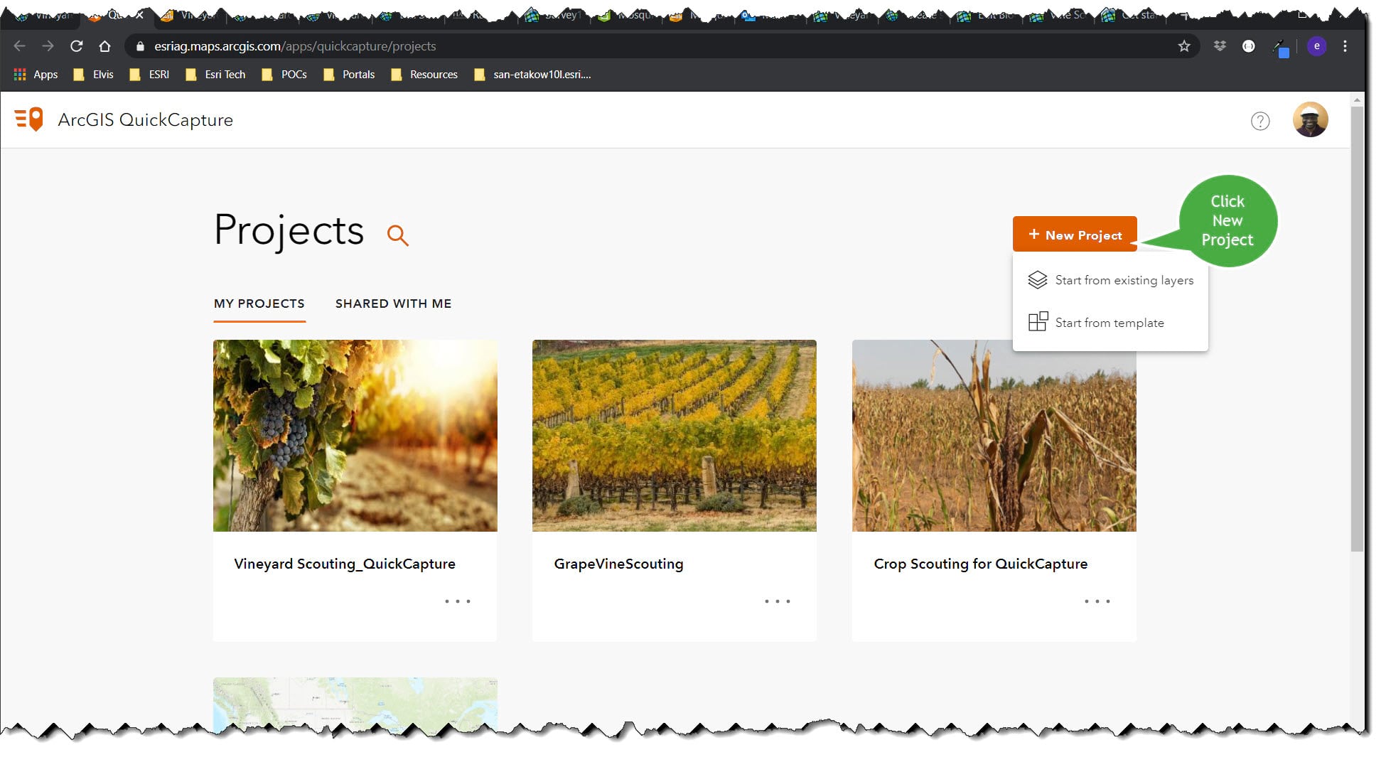 Click ‘New Project’ and select ‘Start from existing layers’ then navigate to the hosted feature layer view created in the previous section.