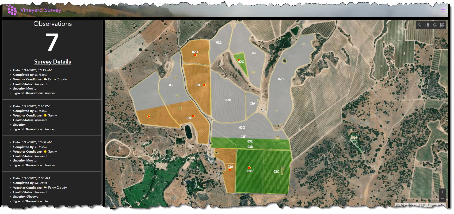 With your Survey123 hosted feature layer configured and the hosted feature layer view designed to your specifications, vine scouting can now be carried out.