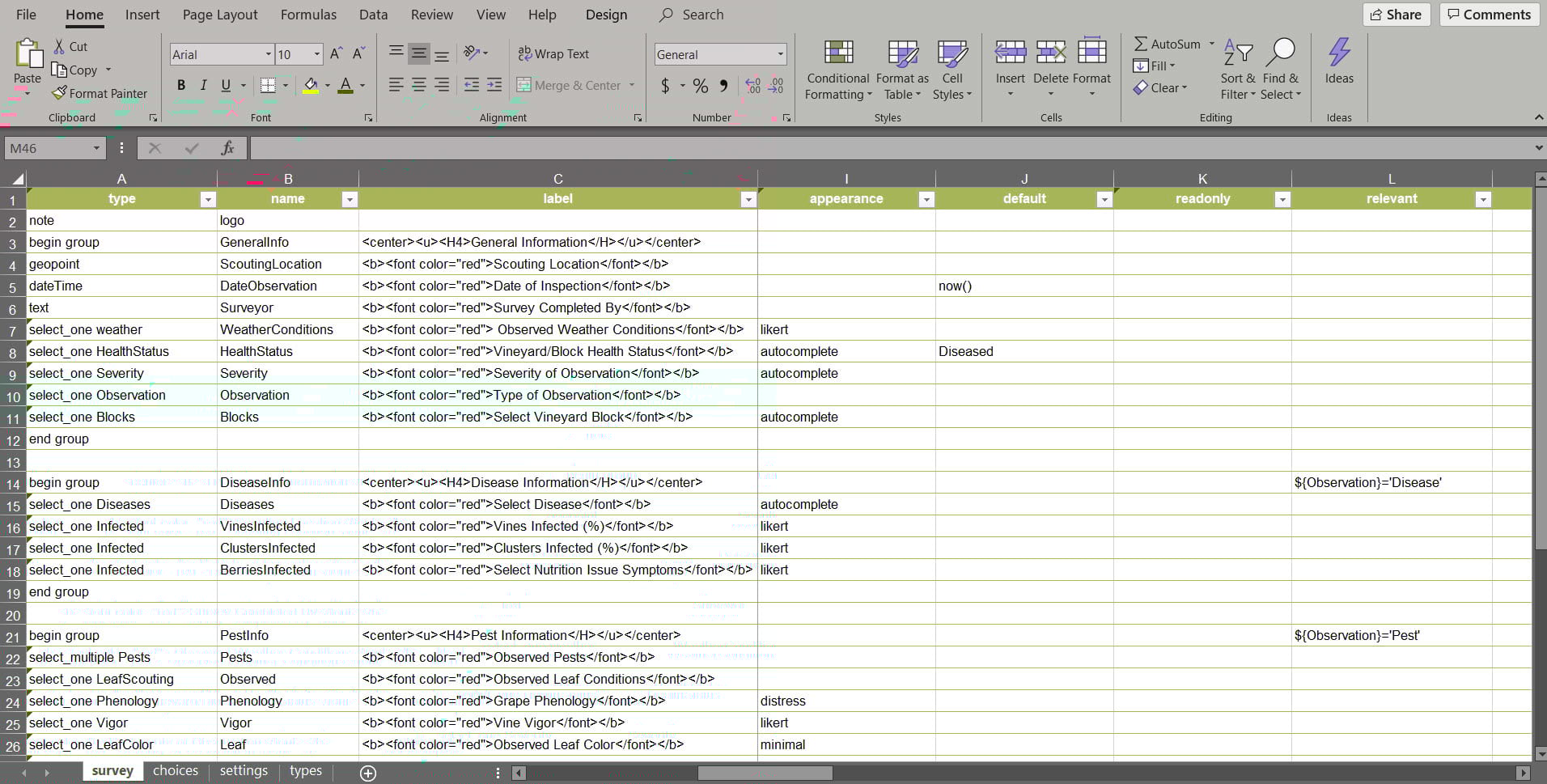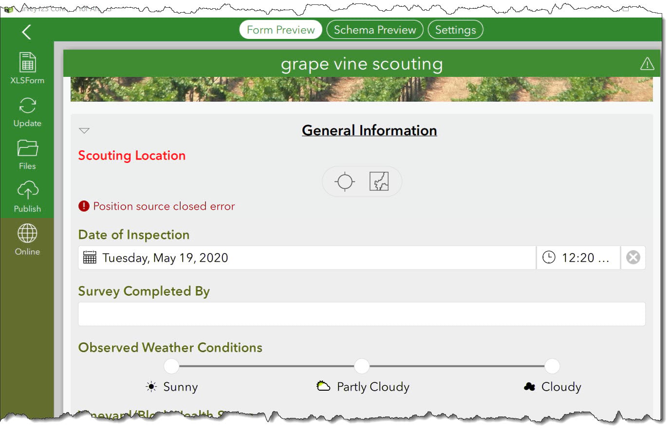 Select the ‘Vineyard Scouting’ form then specify a title and select the option to ‘Create Survey’. A new survey form is created locally and you now have access to the XLSForm. The form is already configured with questions that correspond to the fields in the newly created hosted feature layer.