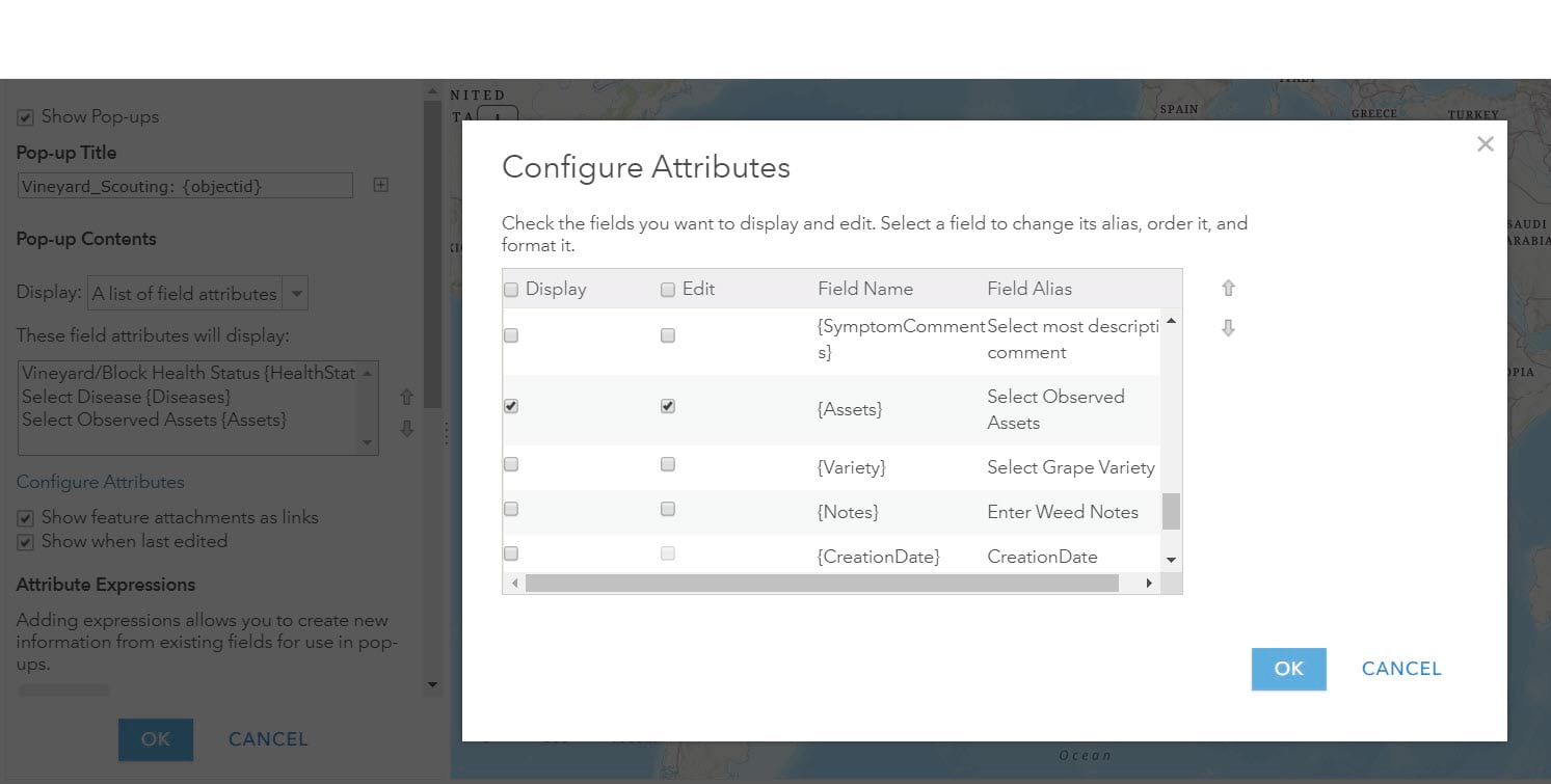 13. Select the option to Configure Attributes then proceed to turn on Display and Edit options for the following fields: HealthStatus, Diseases, and Assets. Check the fields you want to display and edit. Select a field to change its alias, order it, and format it.