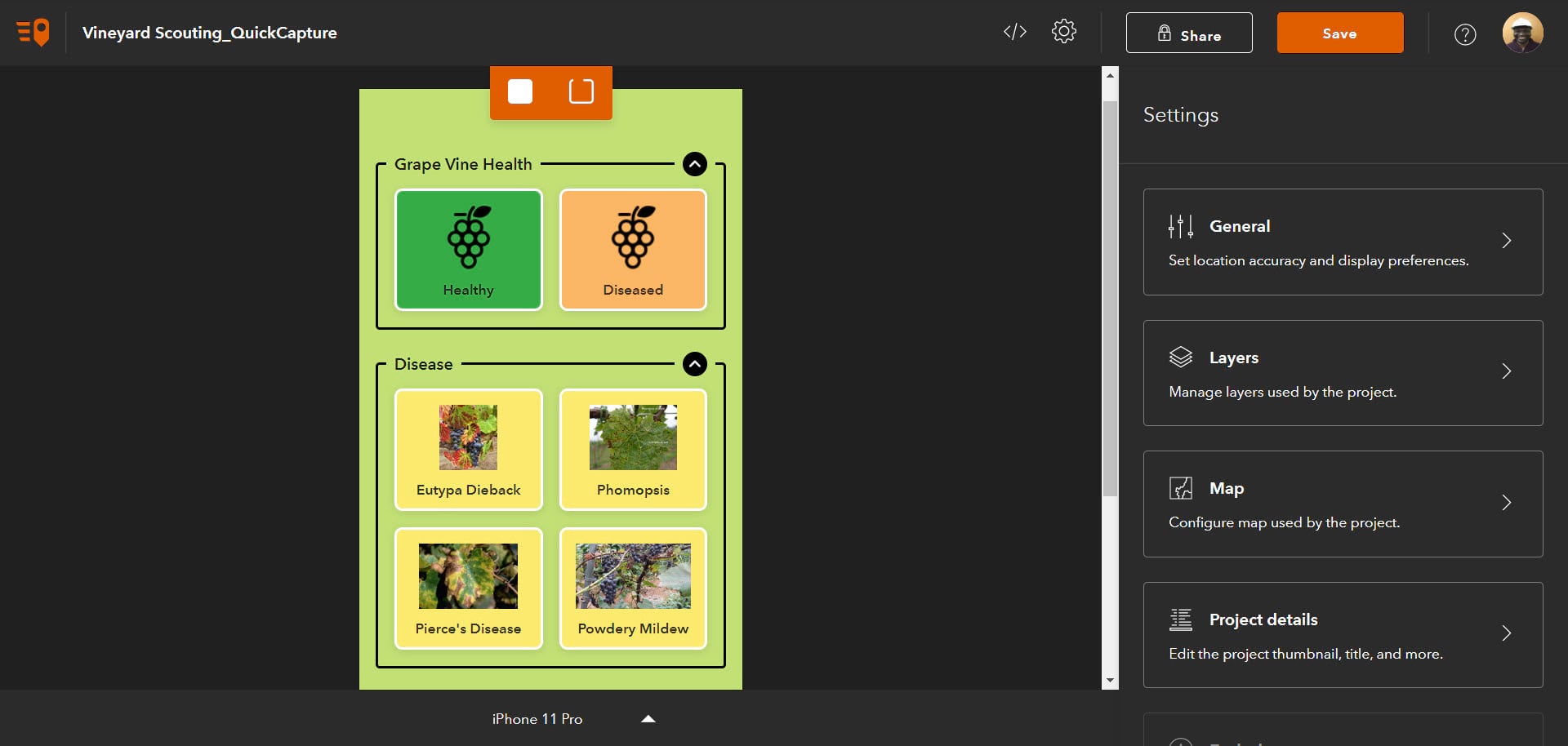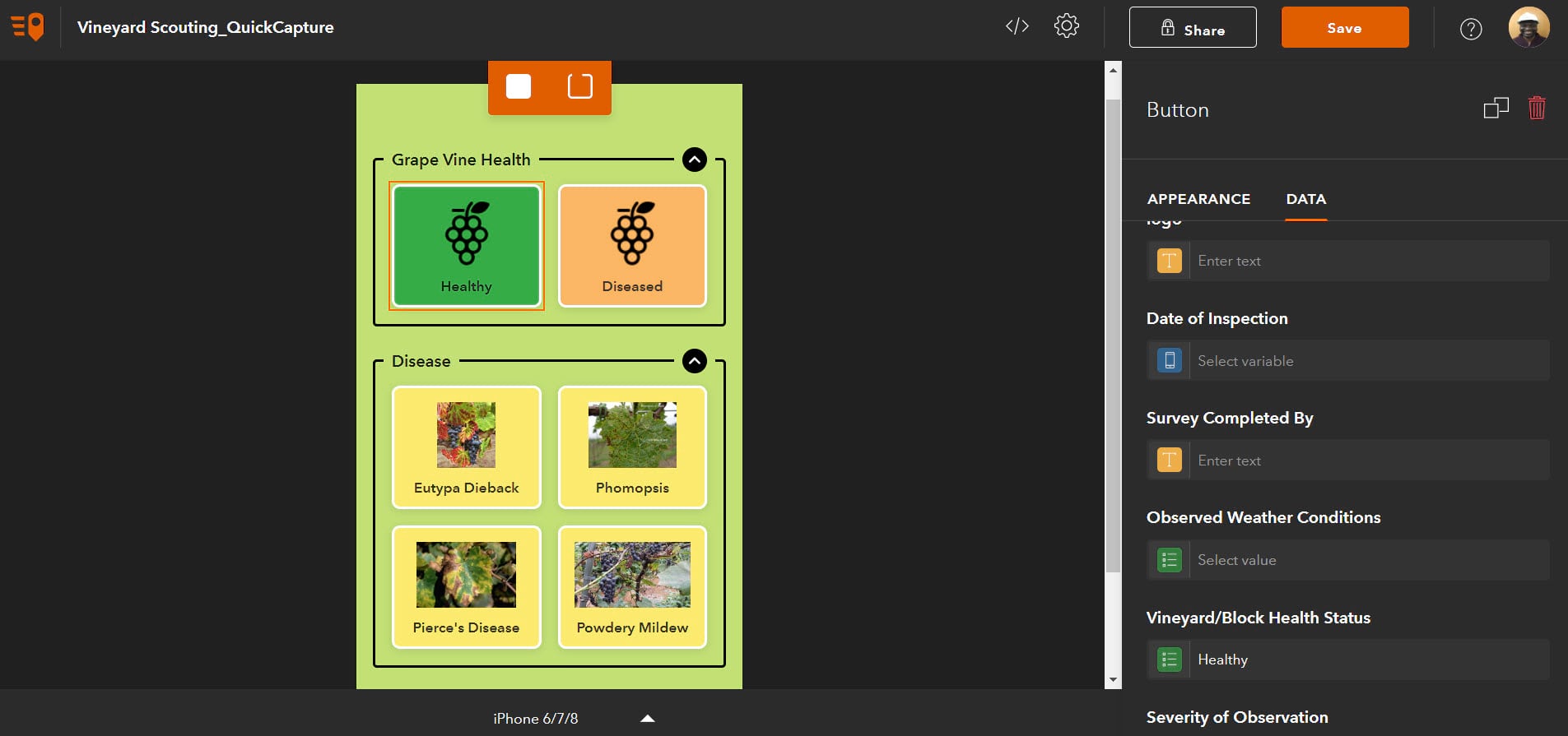 The hosted feature layer view is now ready for use in the QuickCapture designer to create a vine scouting form.
