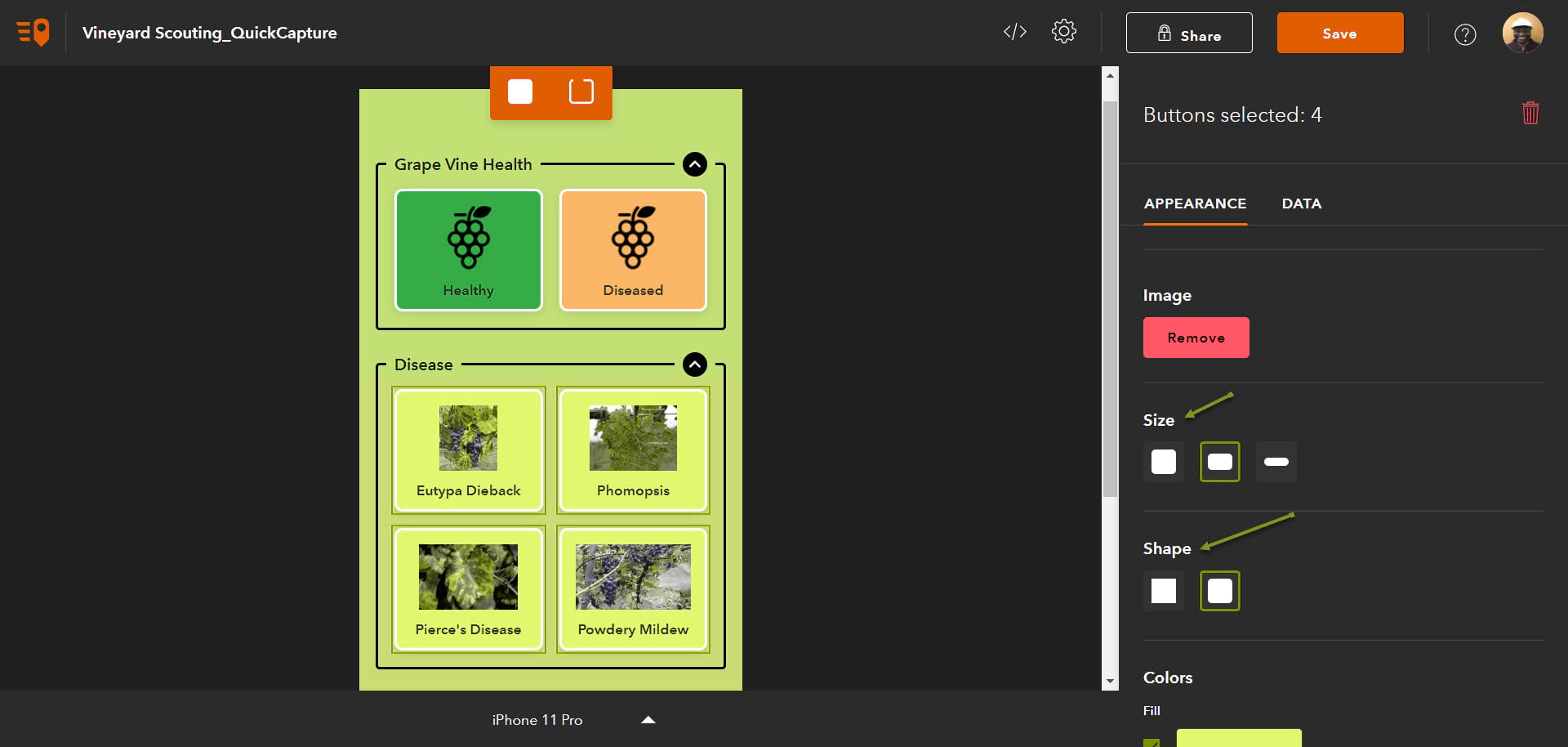 4. Open the Data tab to enable photos for all or just some of the buttons; you can also designated photos as required or take photos with or without a preview. Save and share the project.