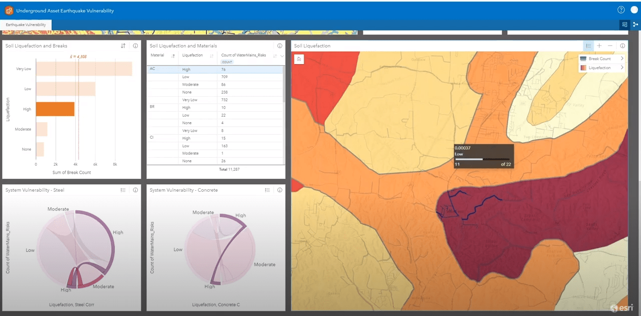 No network is perfect. Understanding vulnerable assets is essential for planning. ArcGIS identifies impacts in the network. It does this by intersecting assets with datasets such as floodplains, ground shaking grids, or COVID-19 social vulnerability areas. The ability to analyze specific hazard scenarios such as the 1% annual chance floodplain or a potential earthquake liquefaction predicts where failure may occur during an event. This prioritizes planning decisions. The demo creates a compelling case for how weakness such as corroded piping can have devasting impacts during an earthquake. Coupled with potential liquefaction, this GIS analysis predicts the “perfect storm” for extreme damage and asset failure.