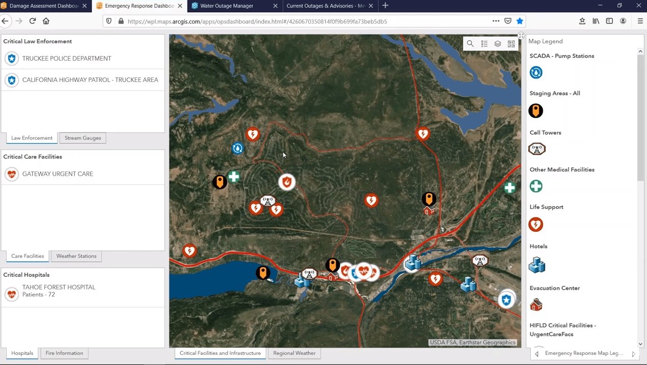 ArcGIS Dashboards provides the perfect way to communicate what’s happening right now. This includes showing clusters of damage. During the demo, we illustrate how planners can prioritize critical facilities, like pump stations for priority restoration. We also highlight real-time weather feeds and their relationship to the network.