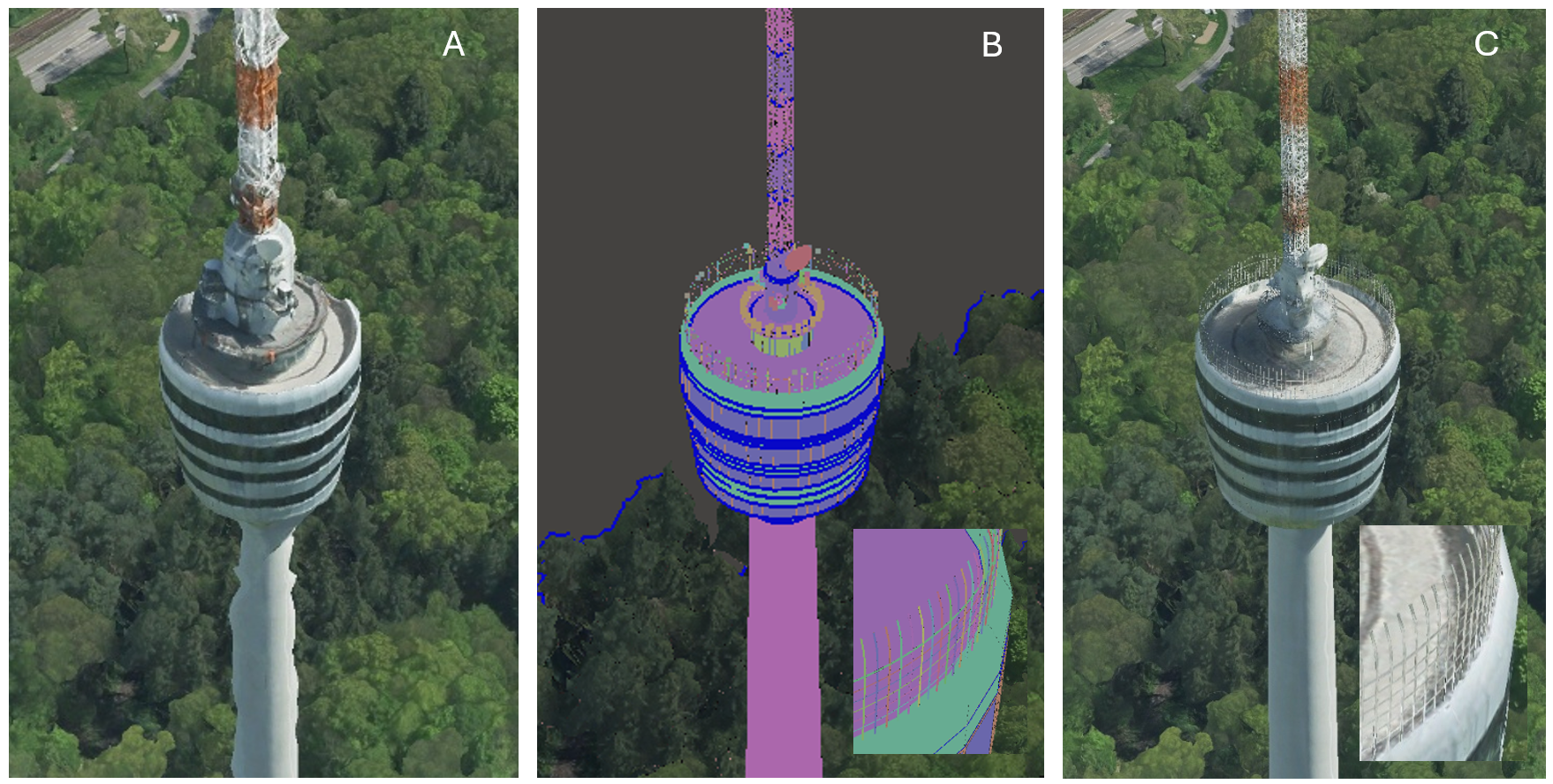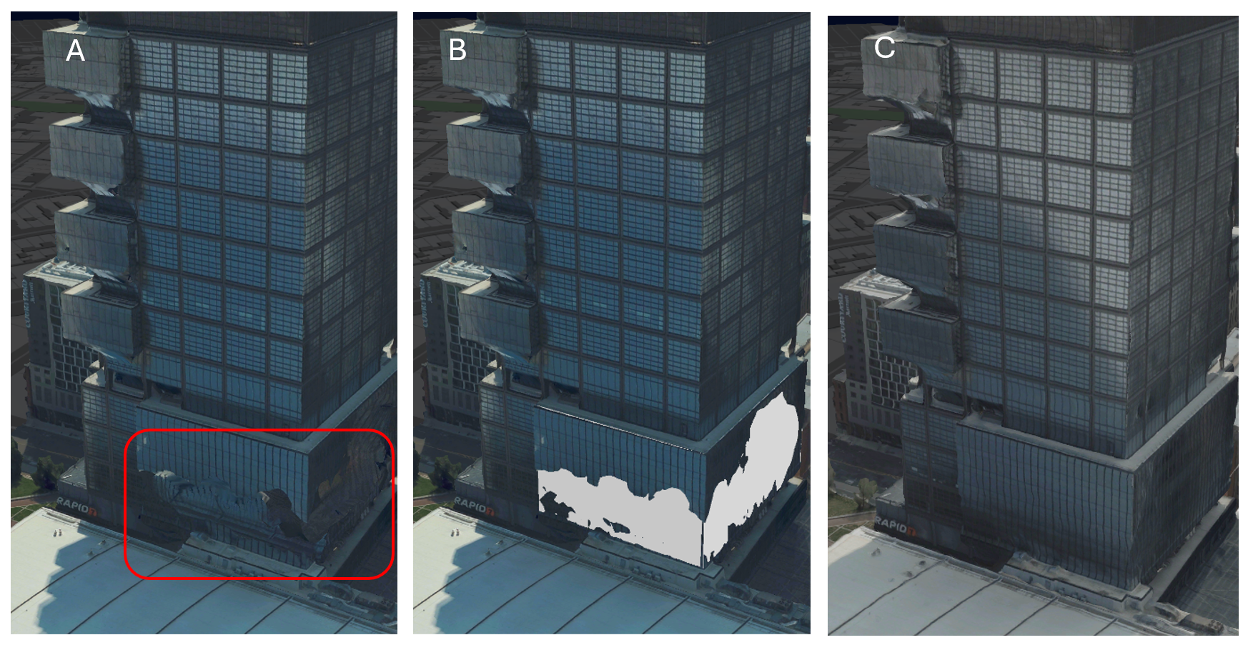 The example above shows an architectural landmark for which there may be a special interest in reconstructing it and its intricate details with the highest possible quality (shown in A). A quality control polygon is drawn to mark this region of the mesh. It is specified when exporting the edit packages to include only the minimum context around the marked defects, enabling effective editing operations. The OBJ file of the edit package can then be opened in an external mesh editing app for manual edits (shown in B). After saving the changes to the same OBJ, the edit package is passed to the reconstruction for integration of the edits into the mesh. The final mesh (shown in C) shows the corrected geometry.