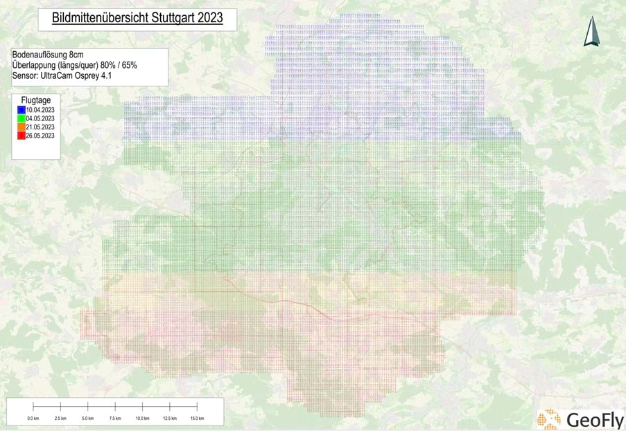 The City of Stuttgart in Germany, as part of its Smart City Stuttgart Concept, has strategic goals to support their offices of Urban Planning, Housing and Buildings. One of these goals is to improve the databases for urban planning within the administration. One initiative that supports this goal is to have a realistic 3D city model created every two years. The City of Stuttgart publishes a public tender for image acquisition, processing, and creation of a Digital Surface Model (DSM), a True Ortho, a Point Cloud, and a 3D Mesh. From a practical standpoint, for a flying company, this entails intricate flight planning, image acquisition, photogrammetric processing, and generating final outputs to aid the City of Stuttgart and its stakeholders in supporting urban initiatives like planning projects. In 2023, GeoFly GmbH, an aerial mapping company for the European market, won this tender.