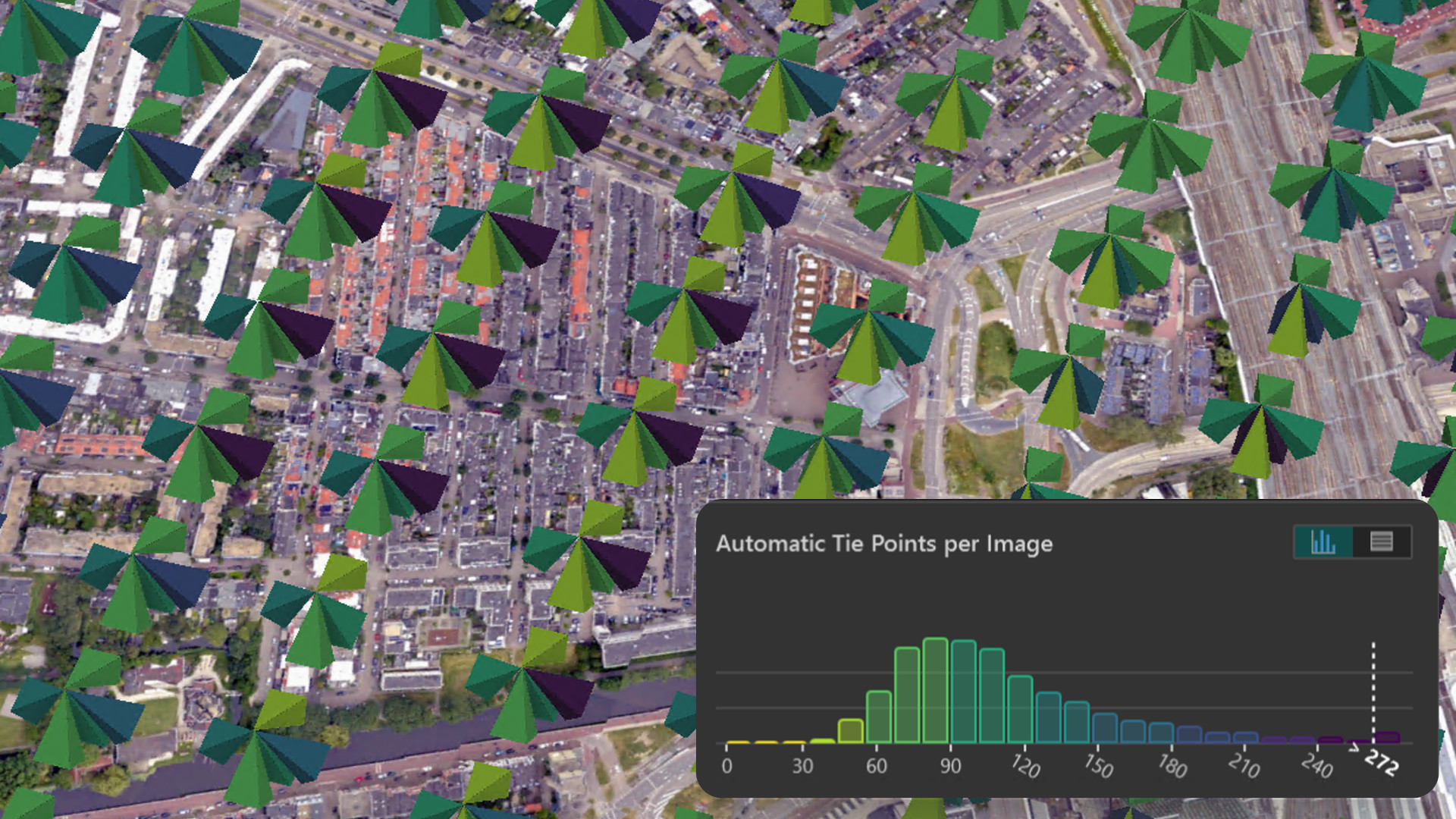 Reality Studio was natively designed to handle complex image configurations derived from oblique image acquisitions. This ensures optimal alignment results and supports the creation of high-quality mapping products, both in the case of traditional nadir-only aerial acquisitions and when slanted views captured by multi-camera oblique systems are processed.