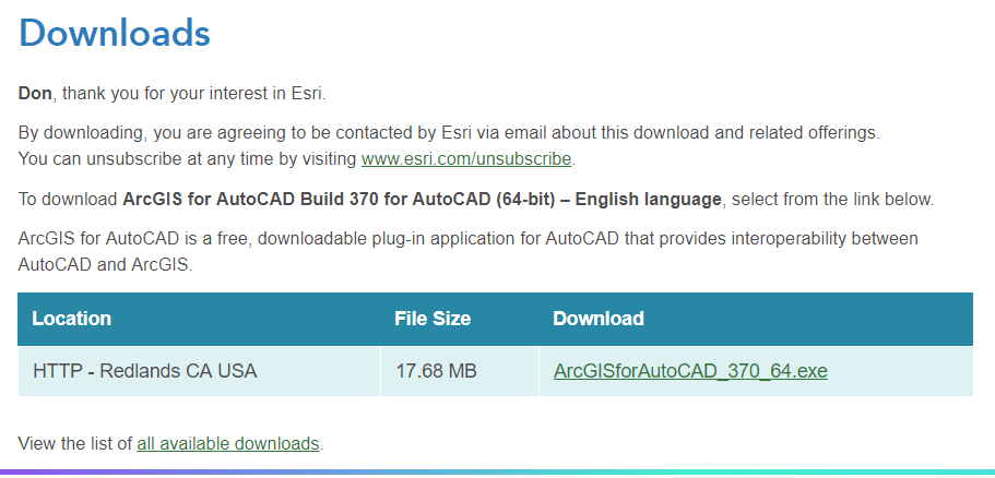 - From the download page on Esri.com download the updated ArcGIS for AutoCAD 370 software for AutoCAD 2015-2019. You will need to enter your global Esri account name. If you don’t have one you can easily create a free one. Follow the instructions and you will get the installation executable downloaded to your computer.