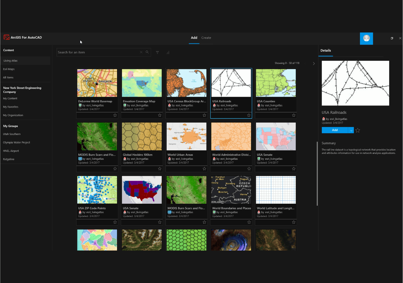 In addition to adding your organization’s own GIS content to your design drawings with ArcGIS Enterprise or ArcGIS Online, ArcGIS for AutoCAD also allows you to add map and feature layers from ArcGIS Living Atlas of the World. ArcGIS Living Atlas is the foremost collection of global geographic information. Curated by Esri with contributions from its partners and user communities, ArcGIS Living Atlas contains maps, data layers, tools, services, and apps for geographic analysis. For design professionals using ArcGIS for AutoCAD, this provides access to high-quality, authoritative datasets such as survey monuments, geology, and terrain that can add further context to CAD drawings.
