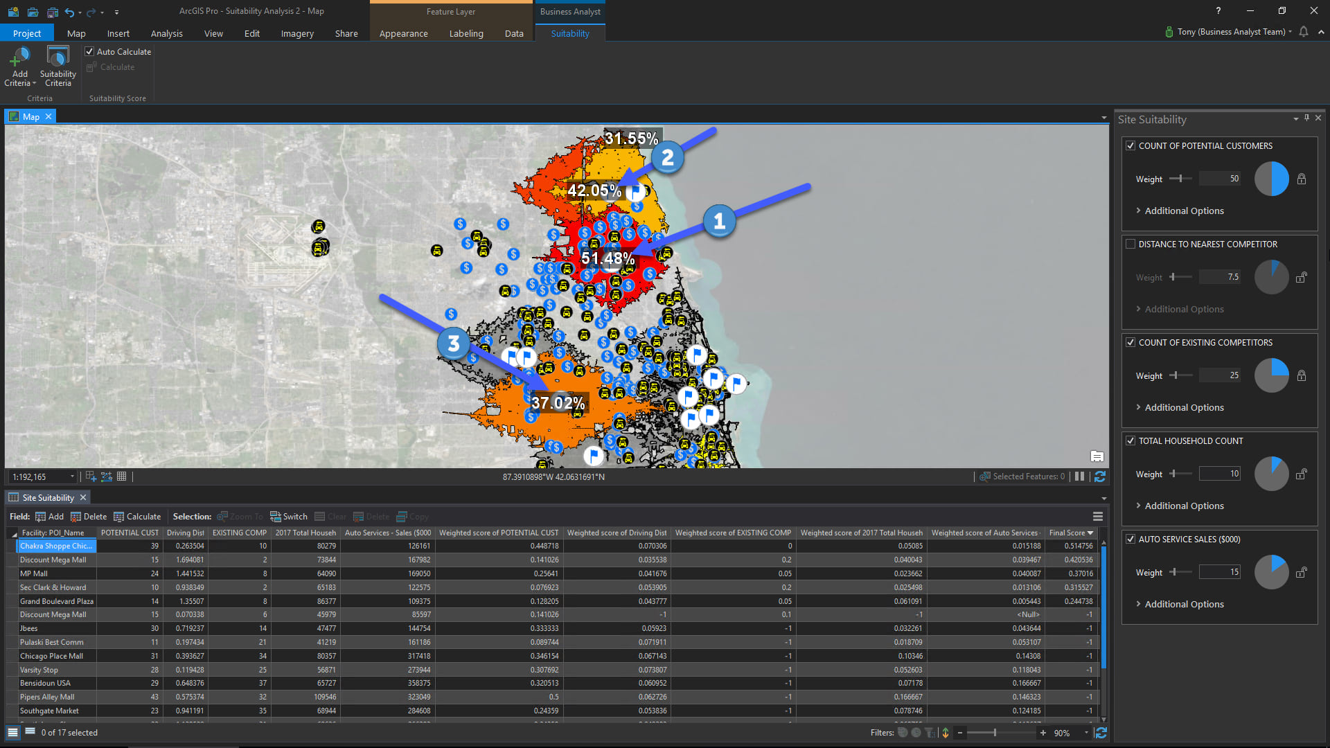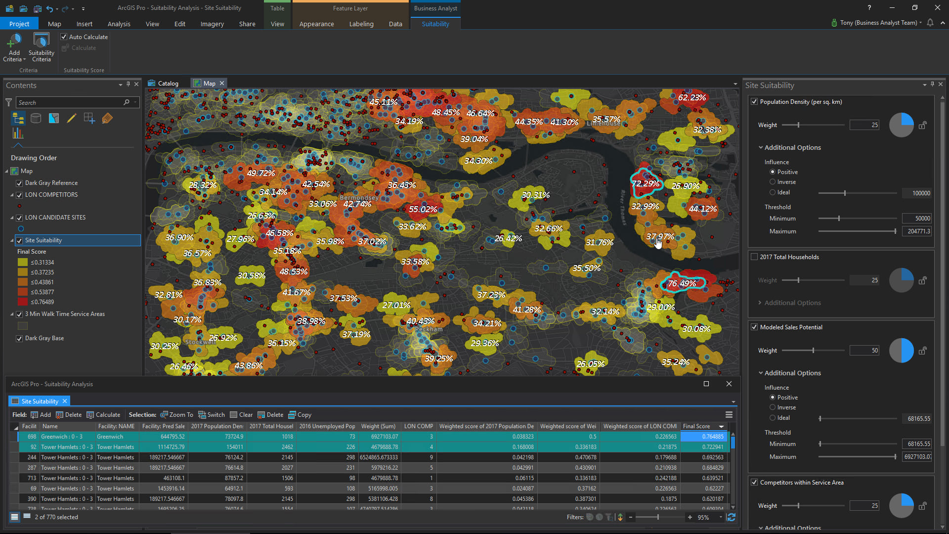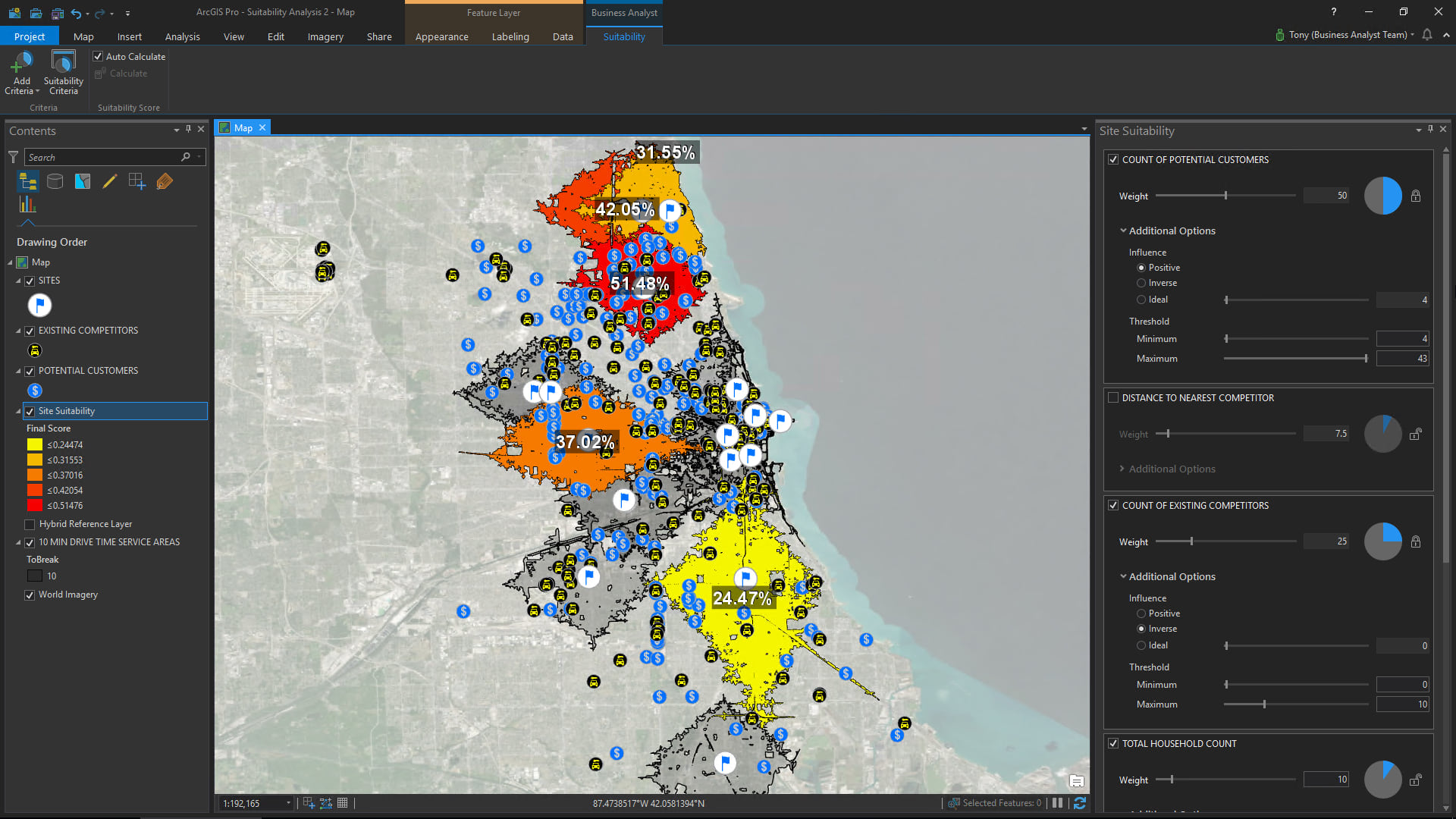 In conclusion, Business Analyst for ArcGIS Pro greatly simplifies and streamlines an advanced site suitability workflow to provide valuable decision support with flexible and intuitive tools, powerful map-based visualization, and support for multiple types of selection criteria.