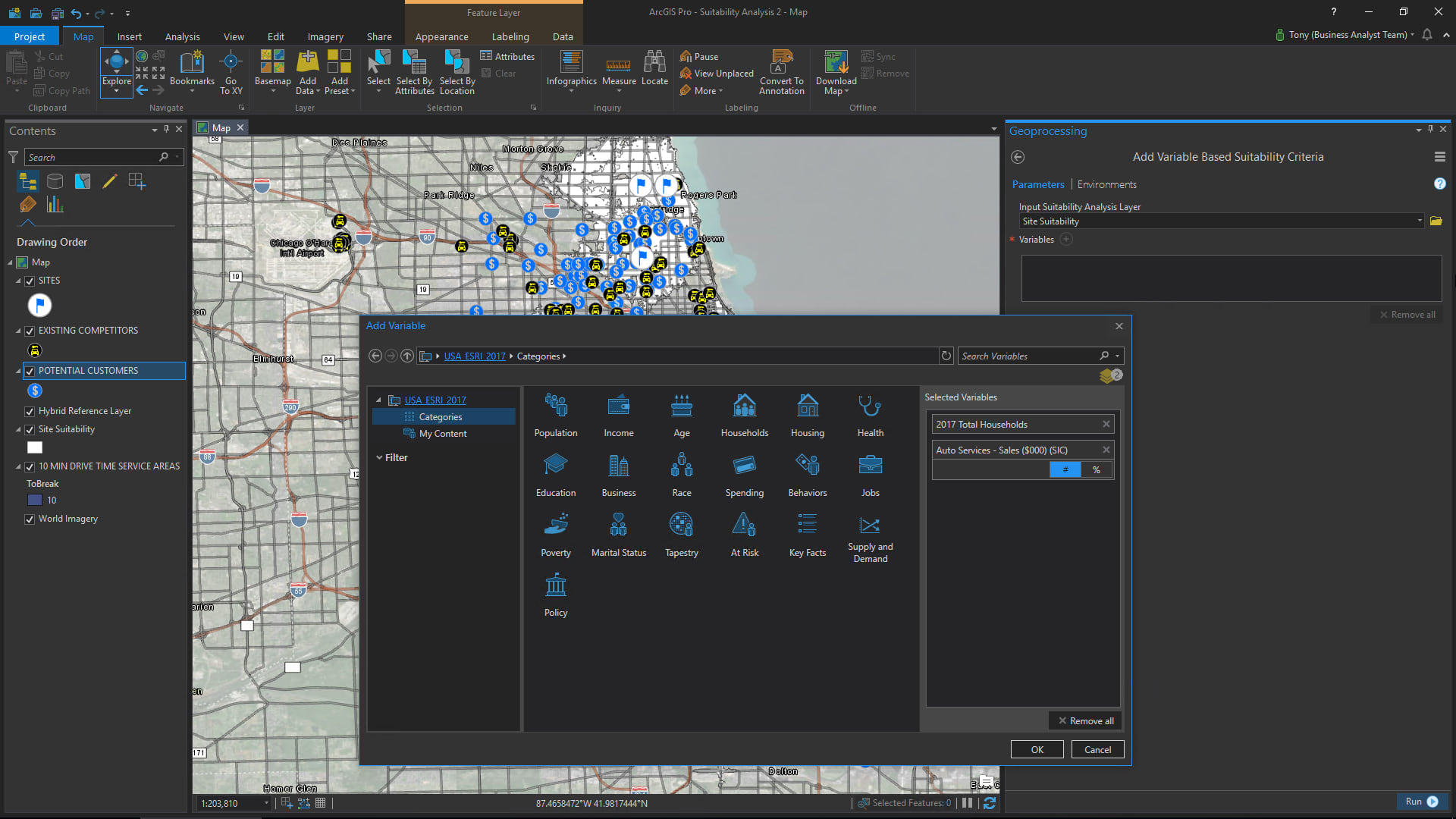 In this post, I’m going to discuss the new Site Suitability Analysis workflow and tools that are a part of the second release of Business Analyst for ArcGIS Pro.