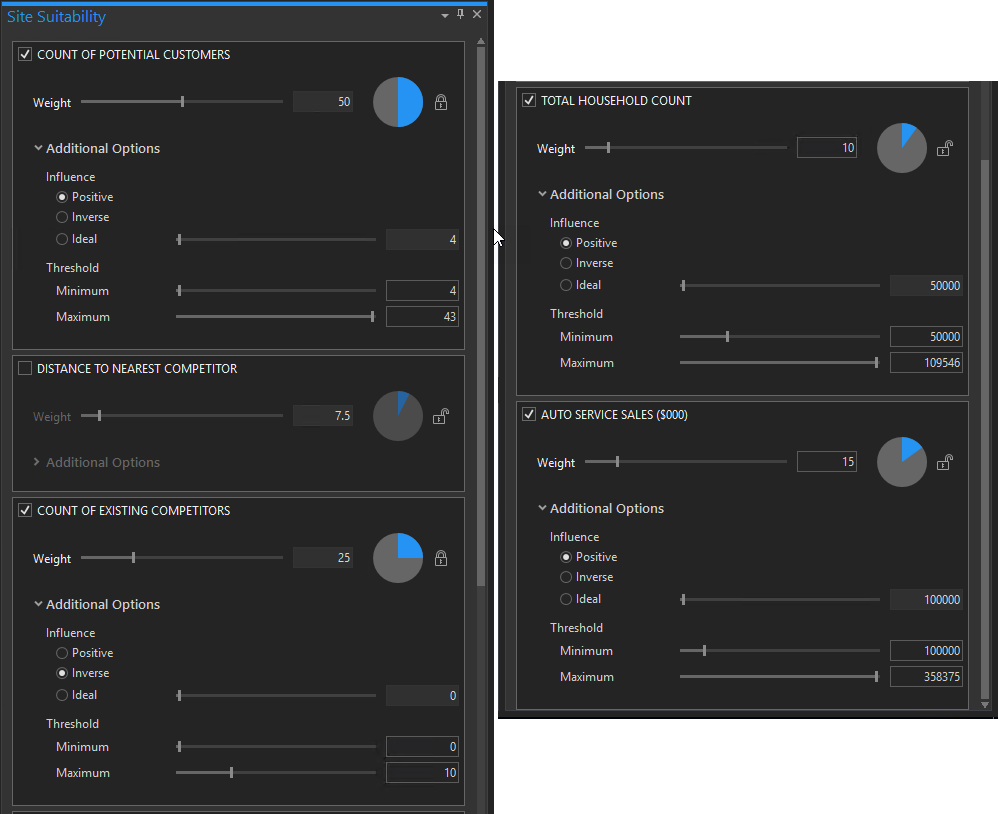 - Attributes that you may append to the Suitability Analysis Layer as part of your workflow (e.g. demographics, business data, consumer behaviors, etc. that you may enrich the layer with)