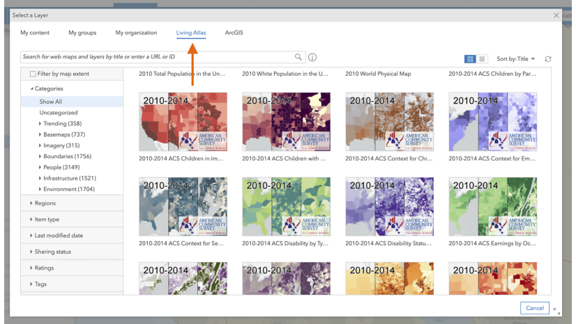 - Click the Living Atlas tab and search for “County Health Rankings 2023” and click the map to open it.
