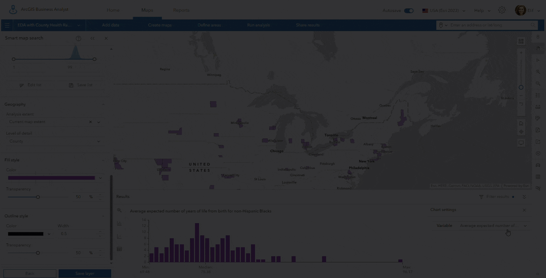 With Business Analyst Web App’s data visualization tools, exploring our data is now much simpler. The smart map search Results pane allows for comprehensive exploratory data analysis and visualizing trends in life expectancy across different race groups. By using several data visualization tools within the Results pane, we gain valuable insights, understanding not only the overall differences in life expectancy but also how various socioeconomic factors may influence these disparities across different race demographics. This process helps us gain a better understanding of the factors that influence life expectancy in the United States.