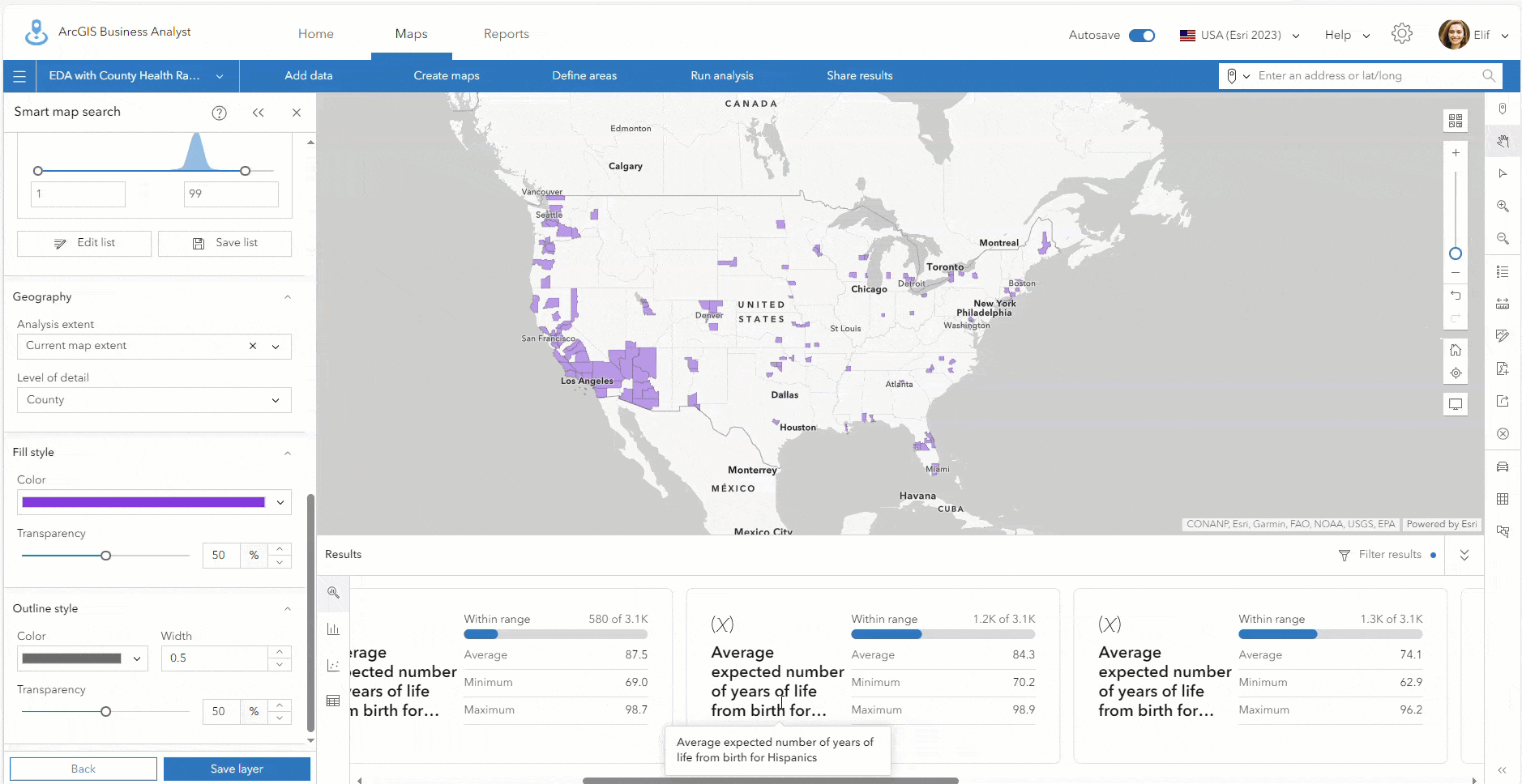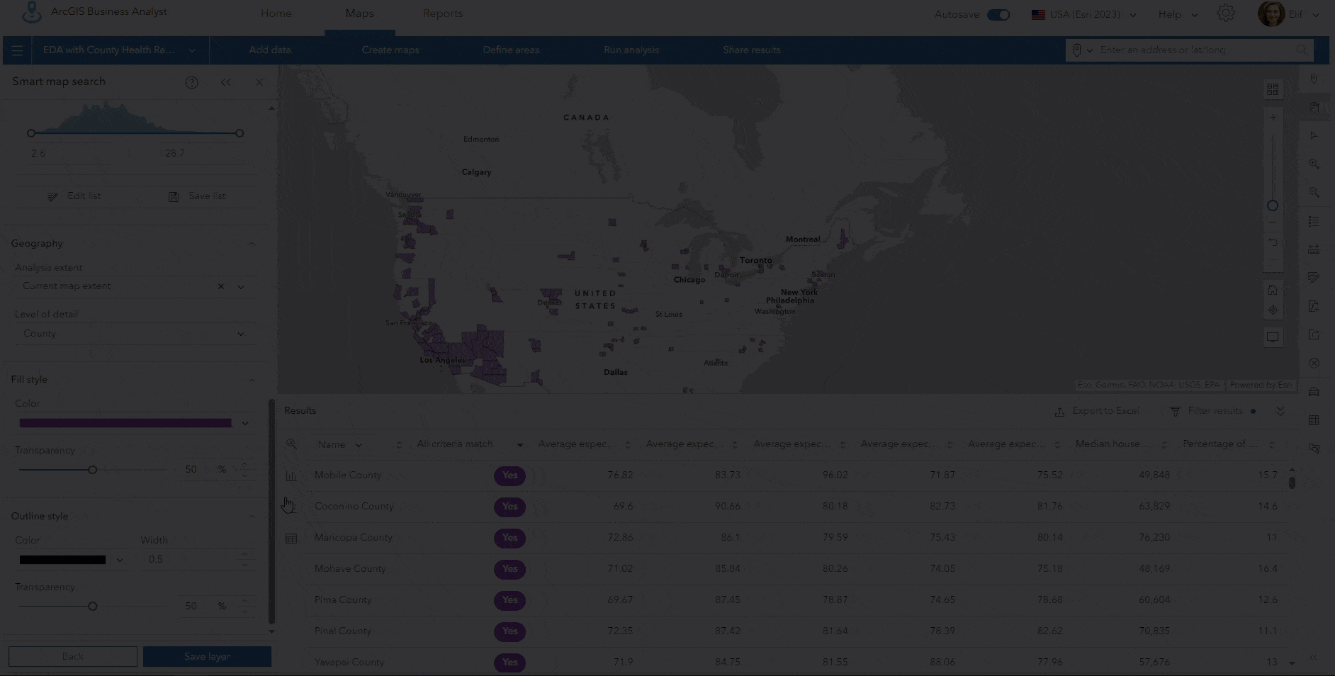 The latest update of ArcGIS Business Analyst Web App expands users’ analytical horizons by providing a new Results pane in the popular smart map search workflow. Smart map search allows you to view areas on the map that match criteria you define. For example, you might start with a question, such as “Which counties in the United States have a lower life expectancy than the current national average of 76.4 years?” This is the type of question for which smart map search can provide a straightforward visualization and answer.