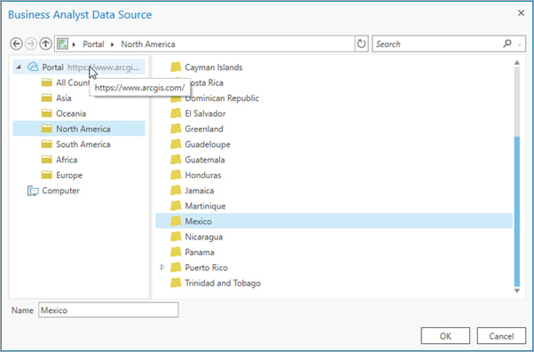 In the Business Analyst Data Source window, click Portal at the top of the left-hand menu and then select from the available continents and countries.